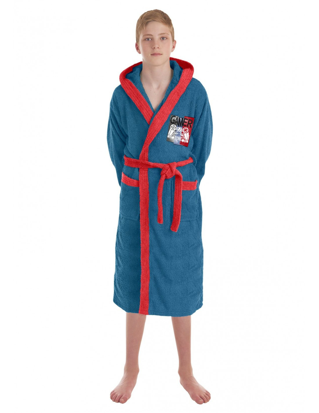 Su diseño en color azul con detalles en rojo, destaca por el delicado bordado de un mando de una cónsola, aportando un toque divertido y original. Incorpora capucha para mayor abrigo, dos prácticos bolsillos laterales y cinturón para un ajuste cómodo y seguro. Un albornoz funcional y acogedor que combina calidad, confort y estilo.