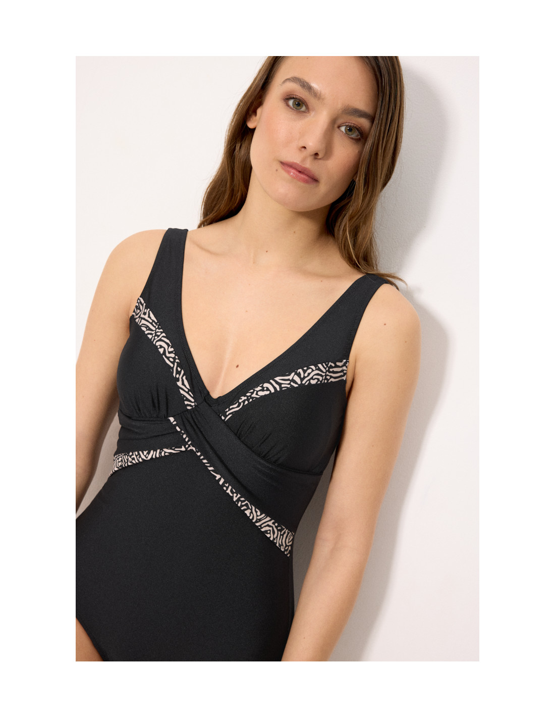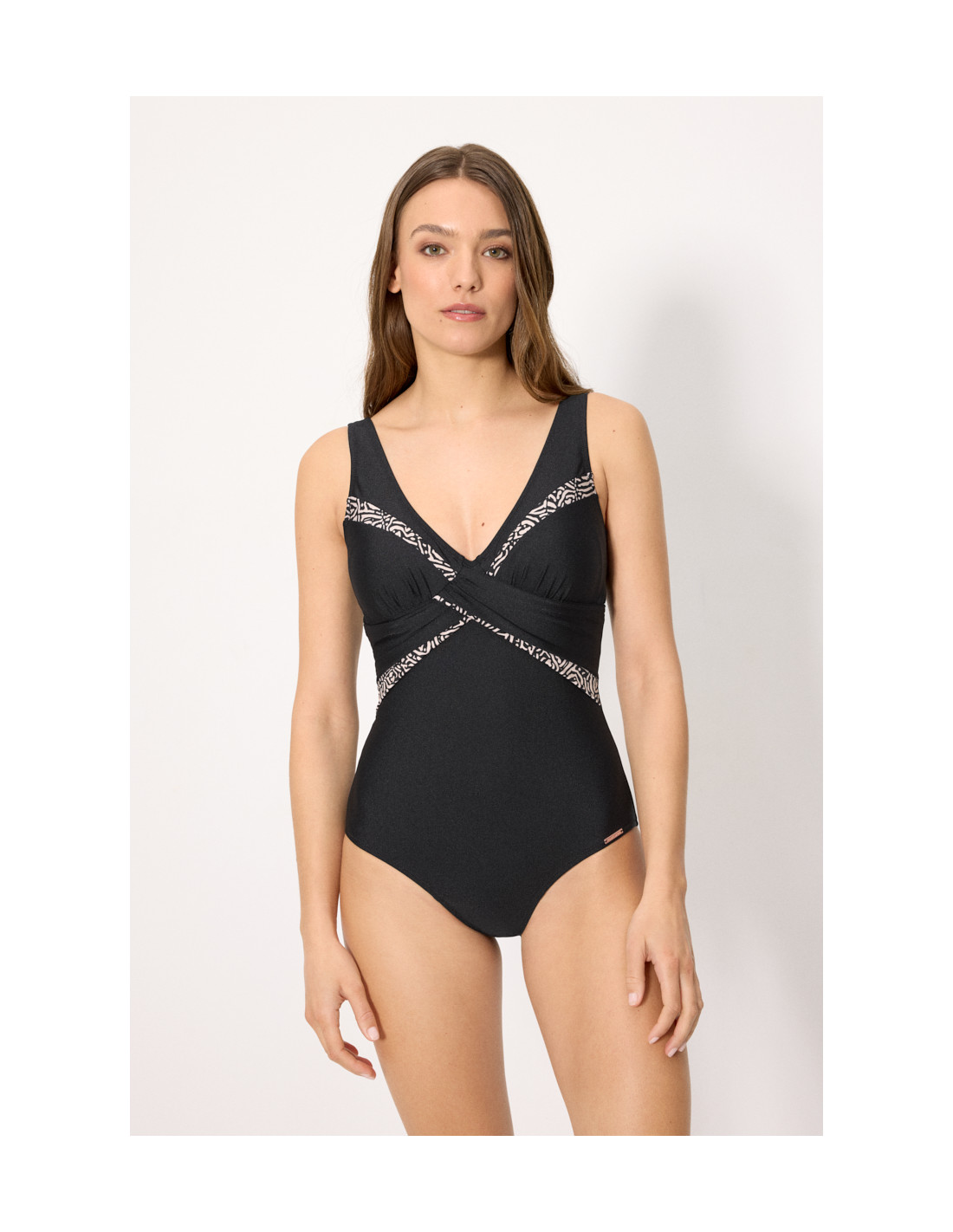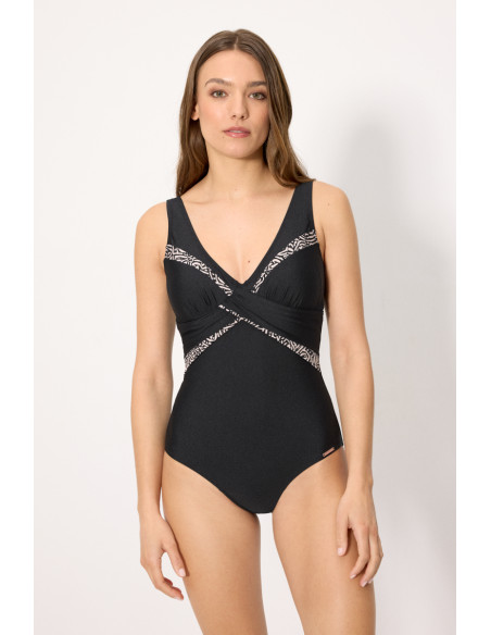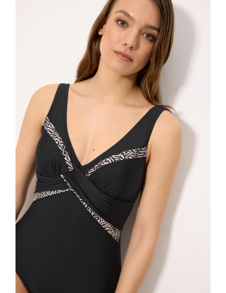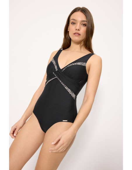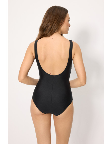 Este bañador incorpora compresión en la zona del abdomen, ayudando a definir la silueta de forma favorecedora. La parte superior, sin aro y con relleno en copa B, proporciona una forma natural y cómoda, adaptándose perfectamente al cuerpo.