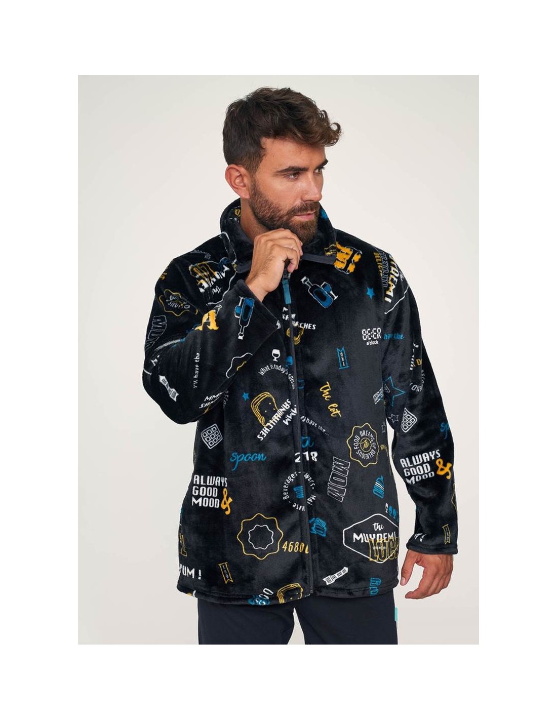 De color negro con divertidos dibujos en diferentes colores, esta bata combina estilo y confort. Cuenta con cierre frontal con cremallera, manga larga y prácticos bolsillos laterales, ideal para el uso diario en casa.