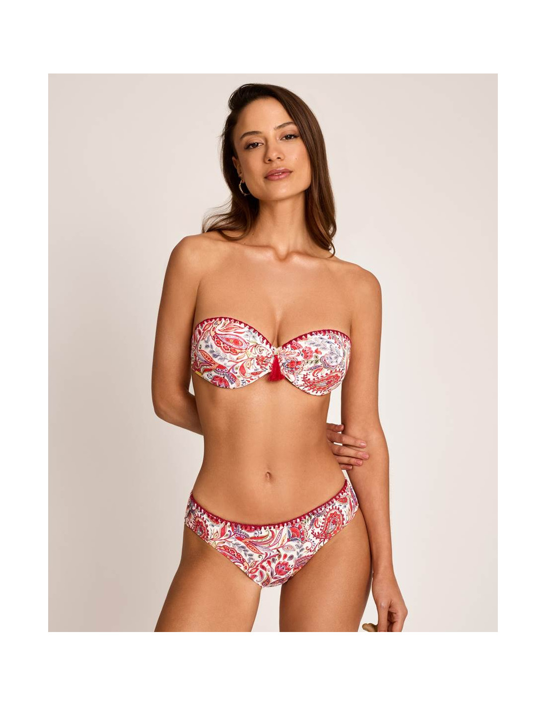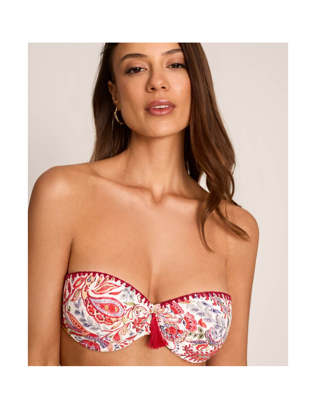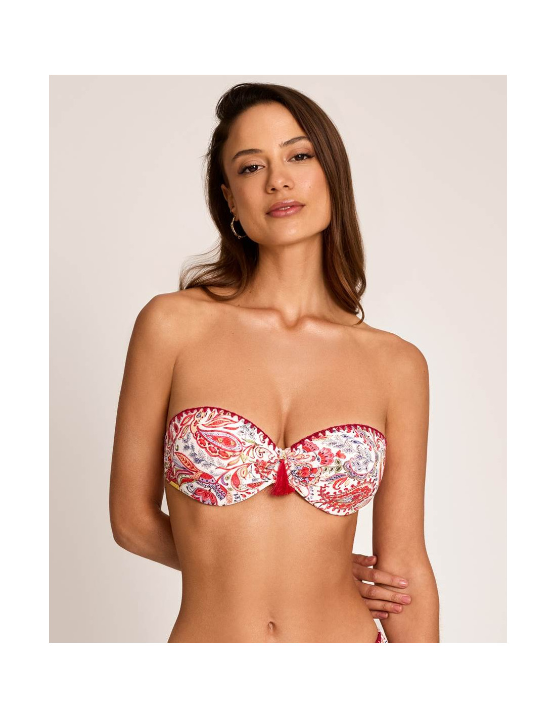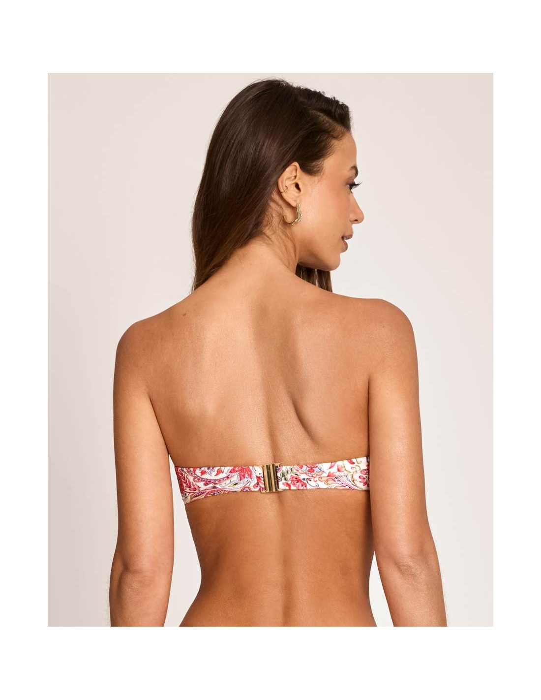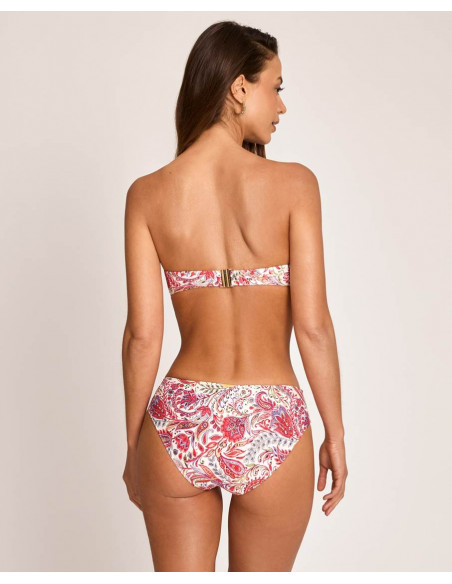 La parte superior tipo bandeau incorpora aro, con relleno y de la copa C, ofreciendo una buena sujeción y un efecto moldeador que realza el pecho. Dispone de tirantes extraíbles, permitiendo adaptarlo a diferentes estilos según la ocasión.