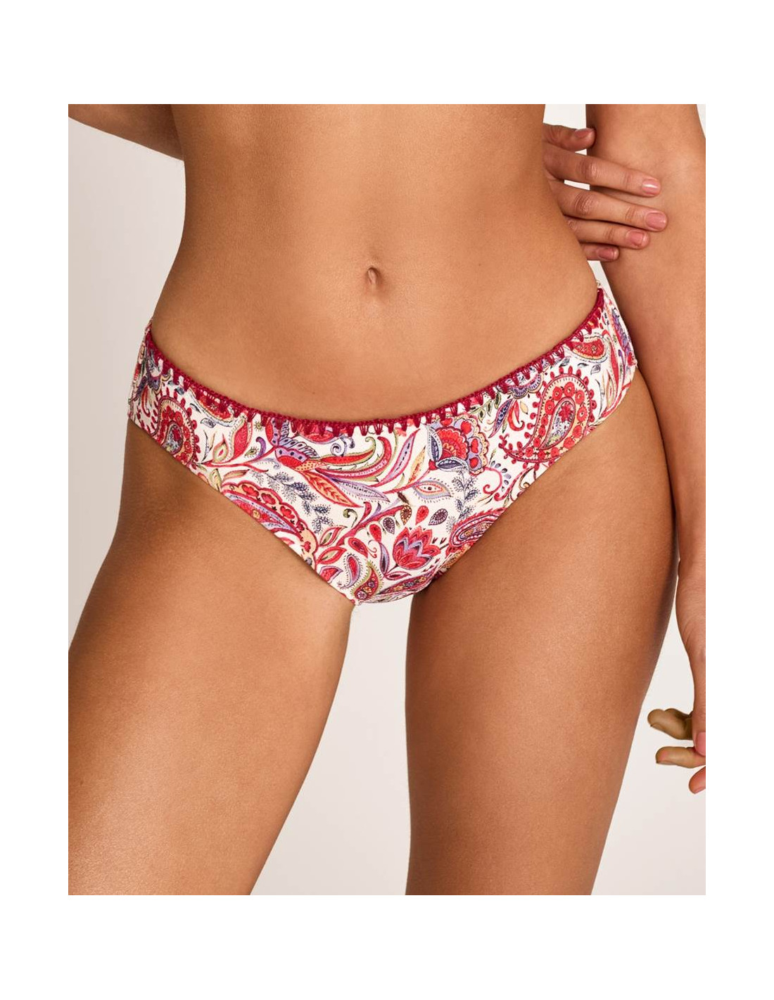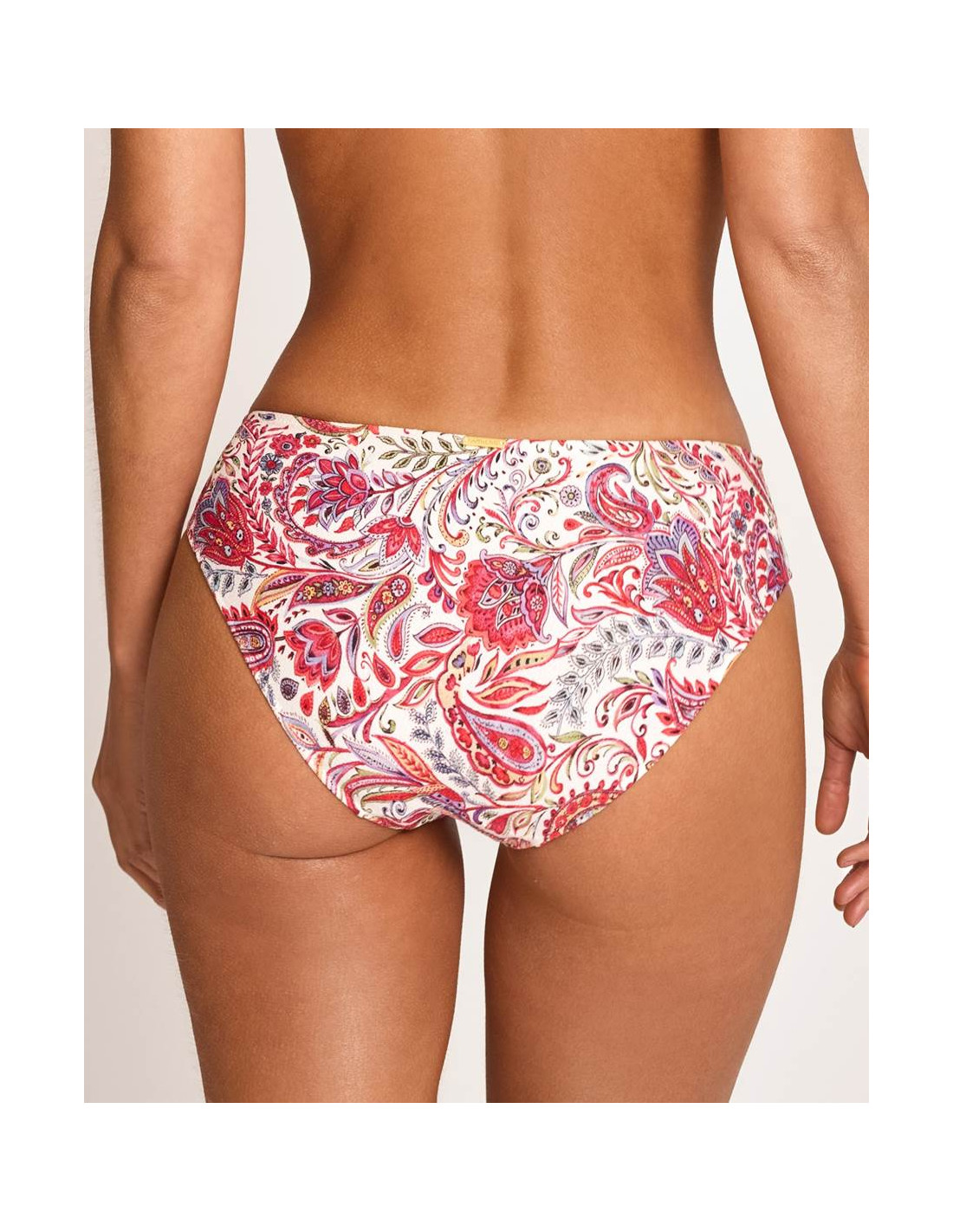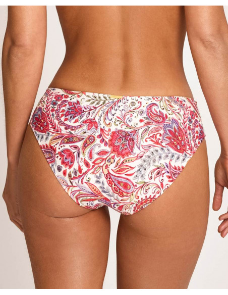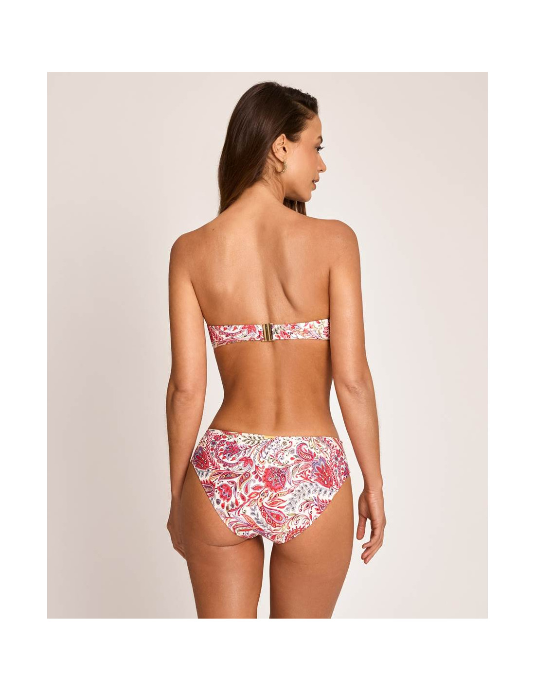 Se combina con una braga de corte bikini que proporciona un ajuste cómodo y favorecedor. Su diseño destaca por un estampado con delicados arabescos, que invitan a perderse en sus formas y transmiten una estética tranquila, equilibrada y contemplativa.
