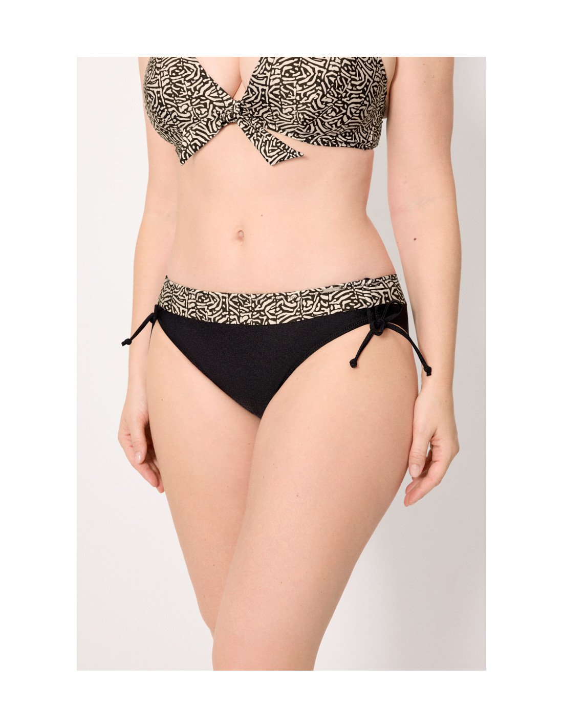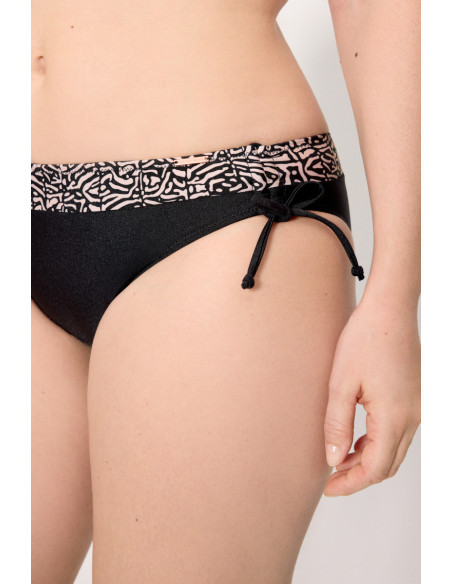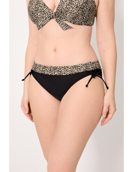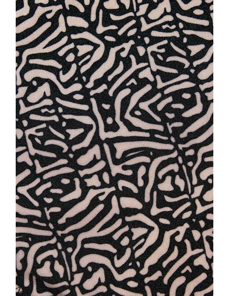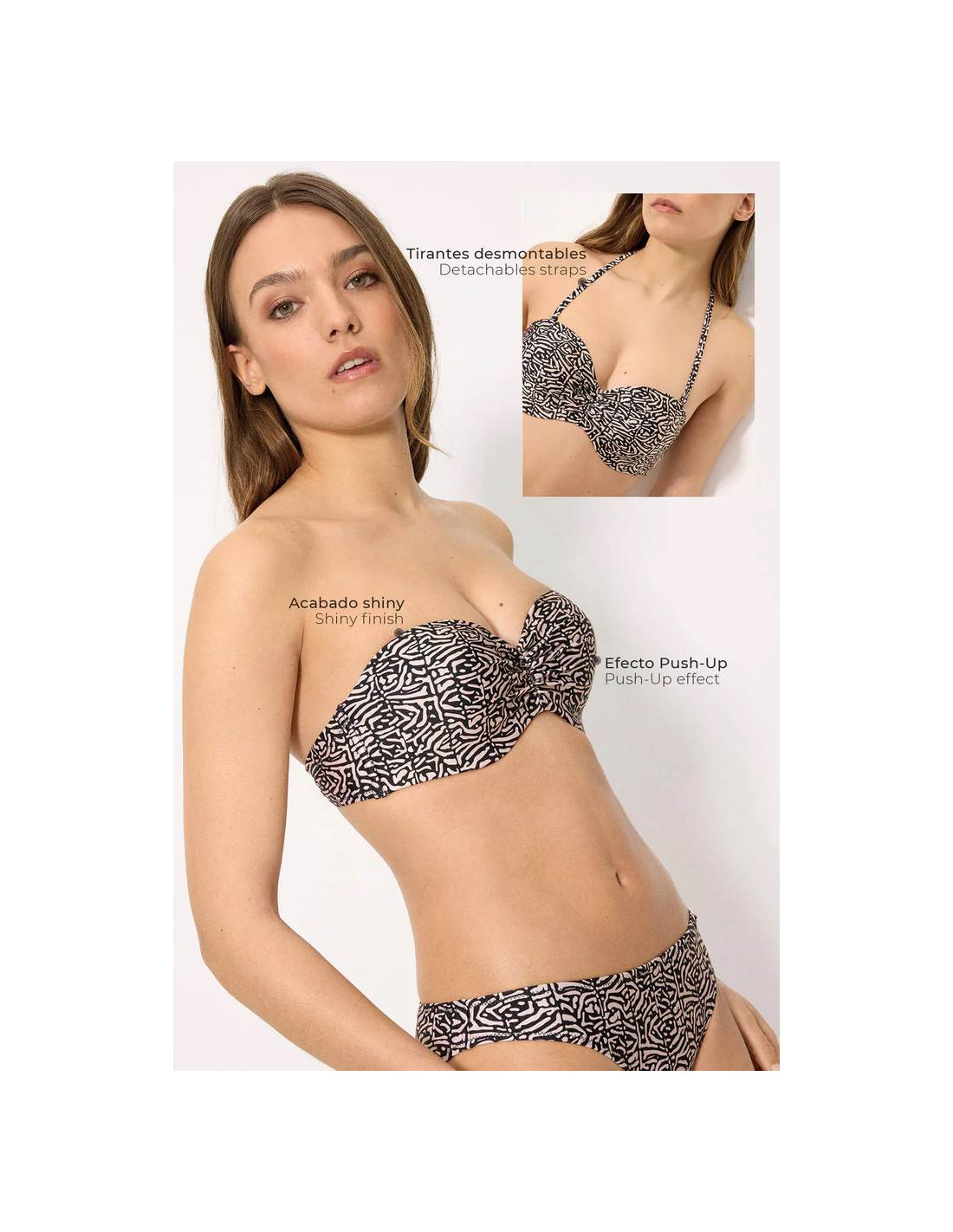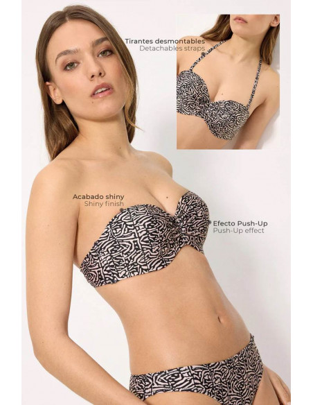 La parte superior tipo bandeau incorpora aro y efecto push-up en copa B, proporcionando una sujeción óptima y un realce natural del pecho. Está confeccionado en tejido con acabado brillante y cuenta con tirantes desmontables que pueden anudarse al cuello o retirarse, permitiendo llevarlo también sin tirantes.