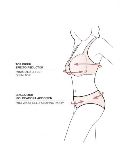 Se combina con una braga alta reductora que incorpora compresión en la zona del abdomen, ayudando a estilizar la silueta y proporcionando una mayor sensación de firmeza.