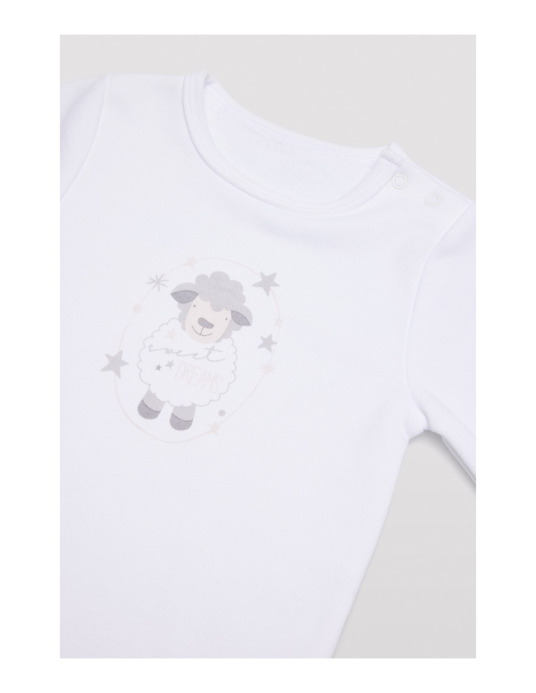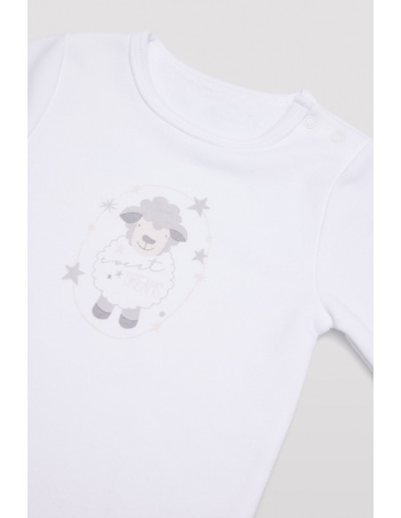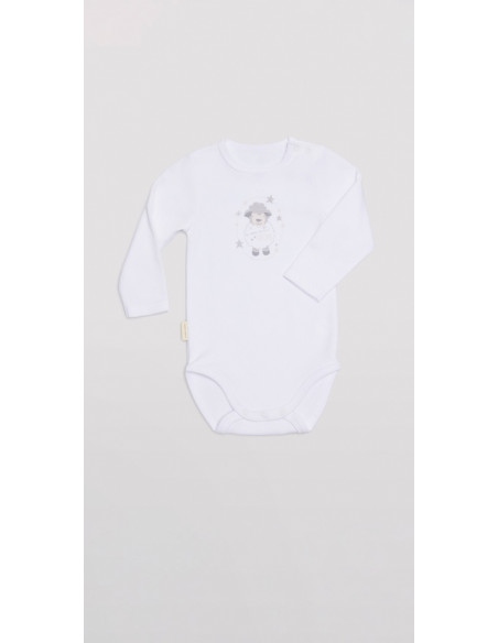 Su diseño de manga larga y cuello redondo ofrece libertad de movimiento y comodidad, mientras que el delicado estampado de una oveja sobre fondo blanco, con detalles en color gris, aporta un toque dulce y elegante. Un body práctico y fácil de combinar, perfecto para los meses más frescos.