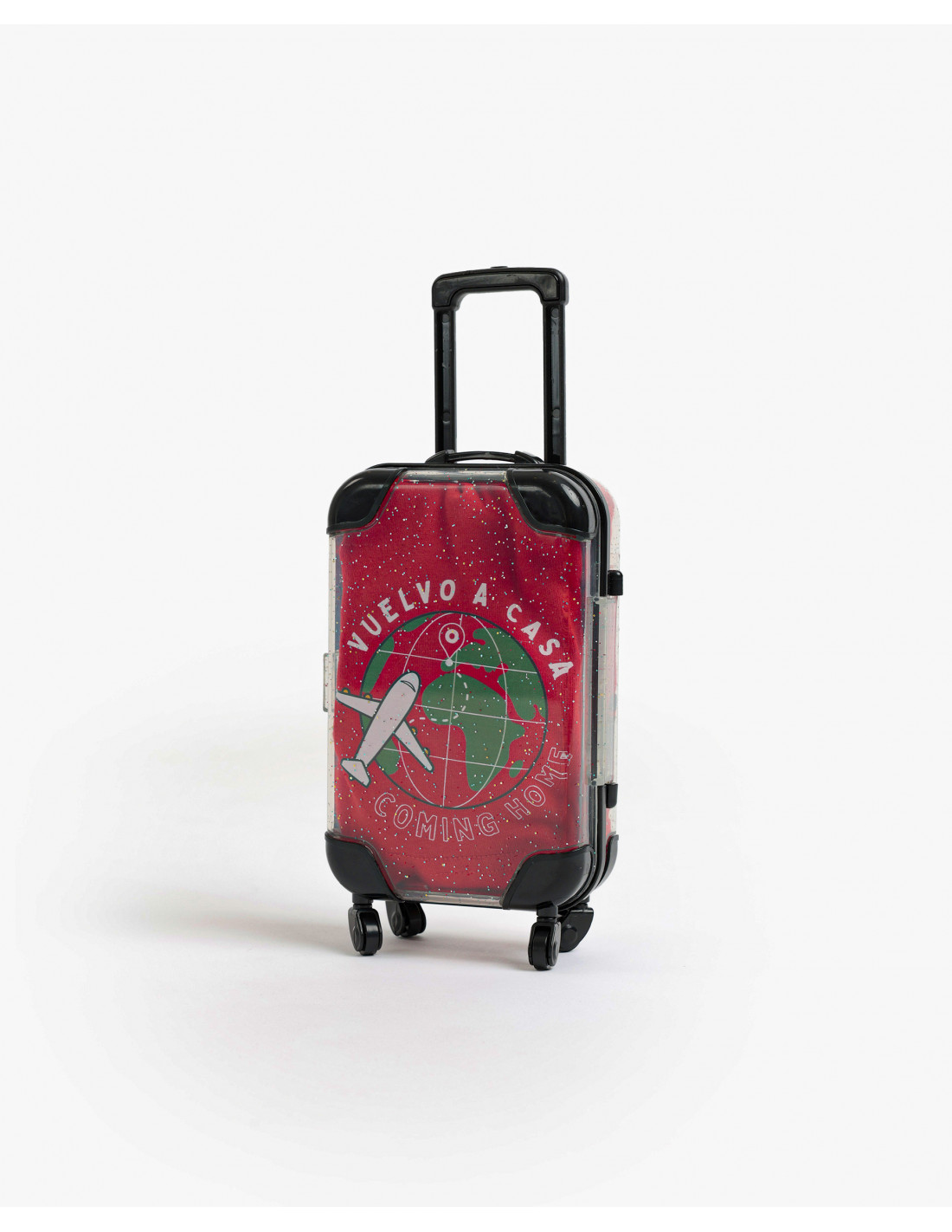 Su diseño estampado con un avión y el mensaje “Vuelvo a casa” sobre fondo rojo transmite un toque entrañable y divertido, ideal para quienes disfrutan del espíritu navideño y de los reencuentros especiales. Además, viene presentado en una original maleta pequeña, perfecta para regalar o sorprender en estas fiestas.
