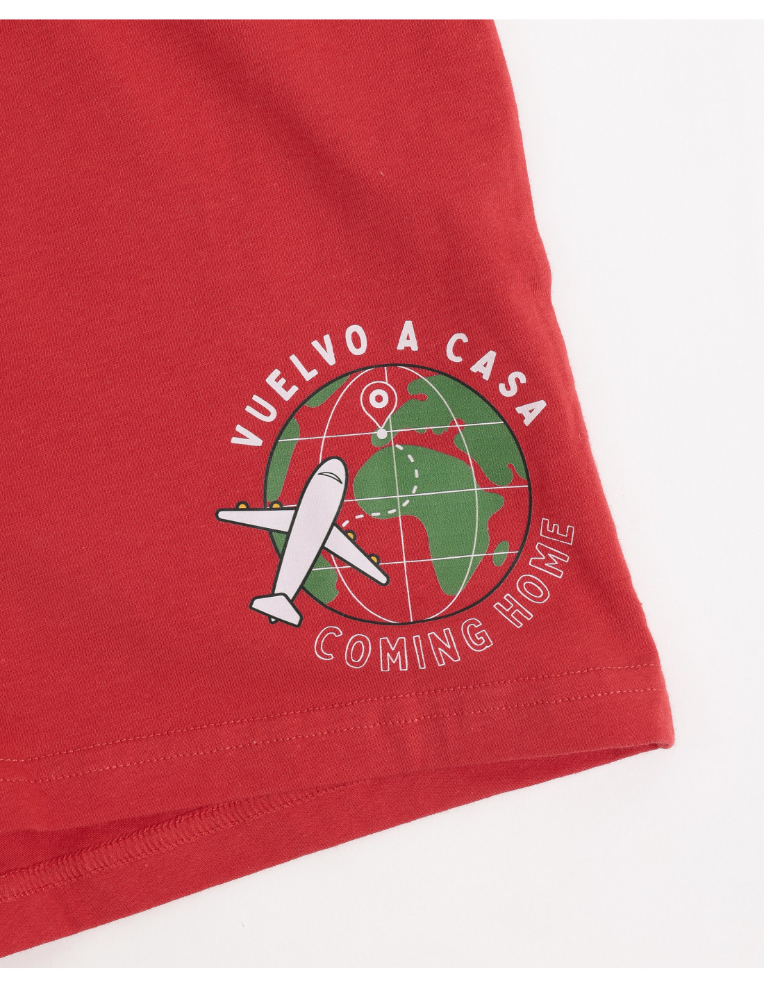 - Diseño estampado con avión y mensaje “Vuelvo a casa”, sobre fondo rojo, lleno de espíritu navideño y emotivo.