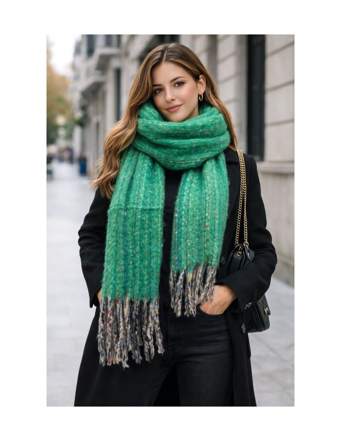 Su diseño jaspeado en colores lisos con sutiles detalles a color aporta un toque moderno y versátil, fácil de combinar con cualquier prenda. Acabada en flecos, añade un acabado clásico y elegante que completa cualquier outfit invernal.