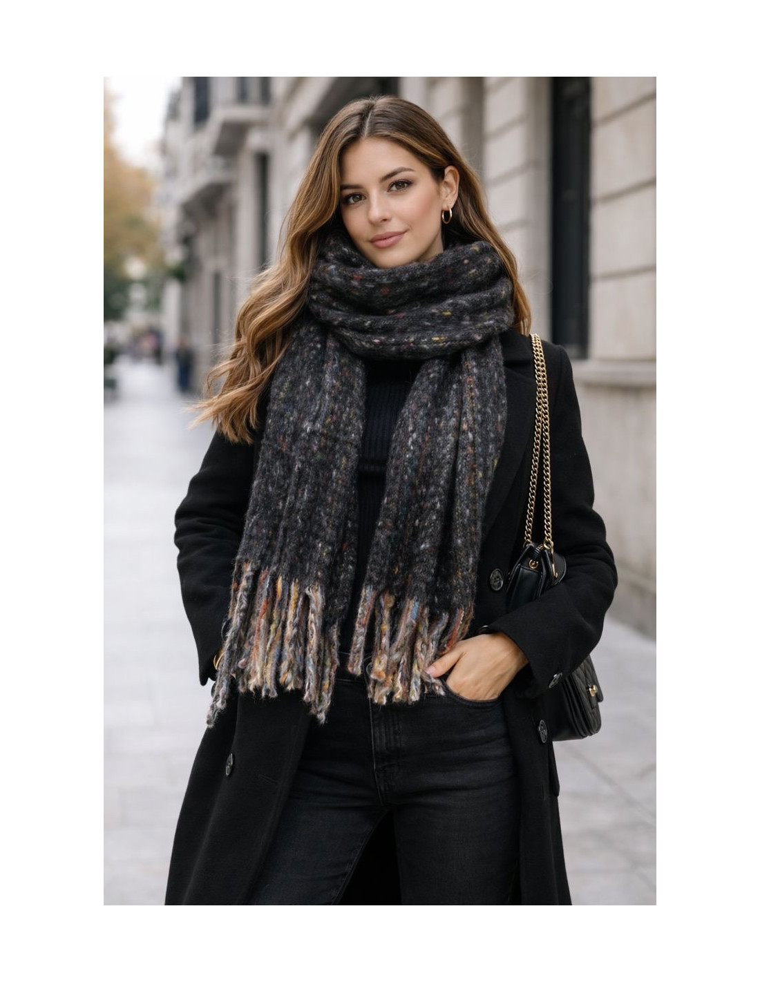 Su diseño jaspeado en colores lisos con sutiles detalles a color aporta un toque moderno y versátil, fácil de combinar con cualquier prenda. Acabada en flecos, añade un acabado clásico y elegante que completa cualquier outfit invernal.