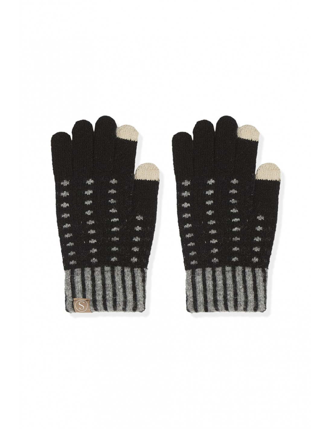 Estos guantes están remallados a mano y sin costuras en los dedos, lo que evita roces y proporciona un extra de comodidad. Con un diseño que combina puntos y rayas sobre fondo negro, añade un toque moderno y versátil, fácil de combinar con cualquier look de invierno.