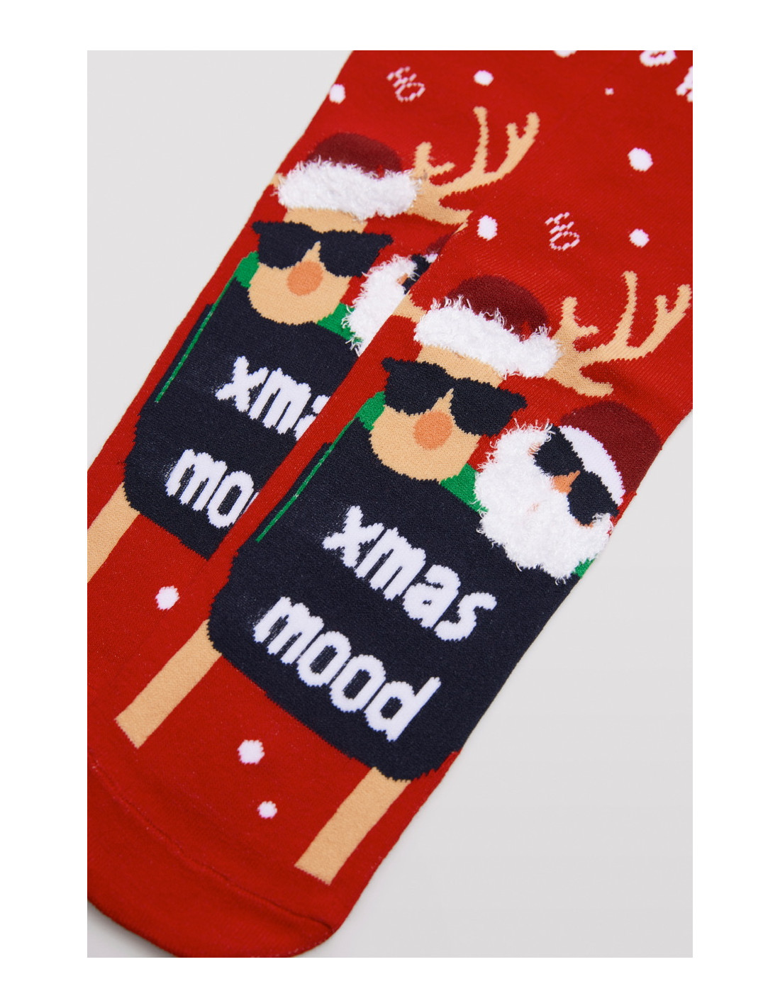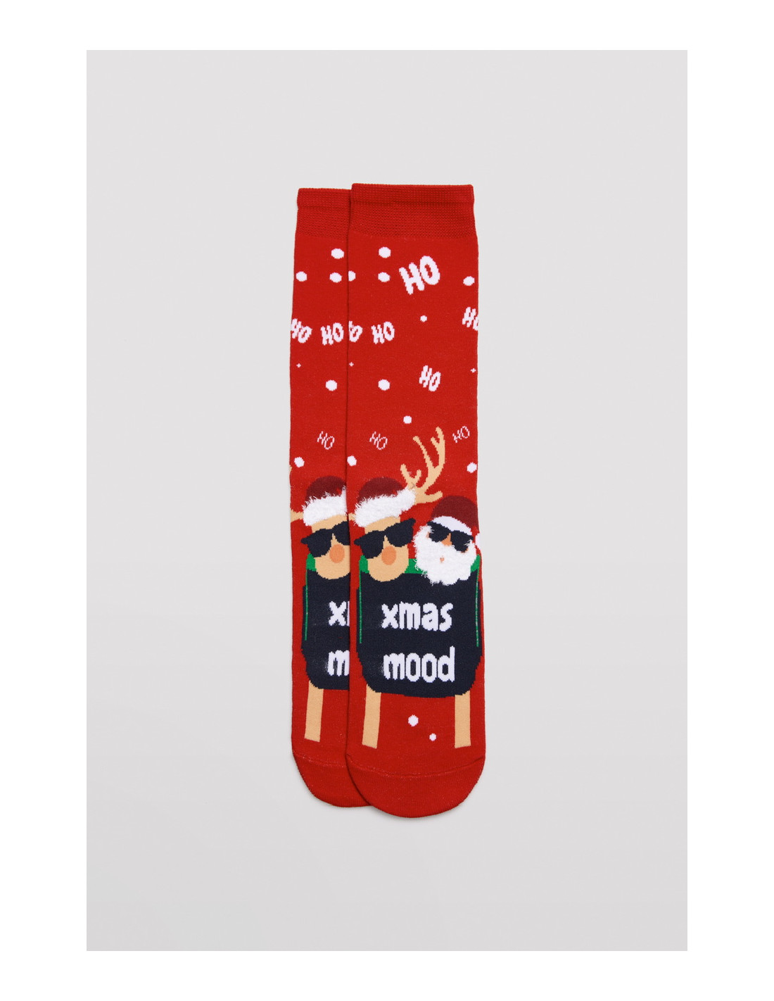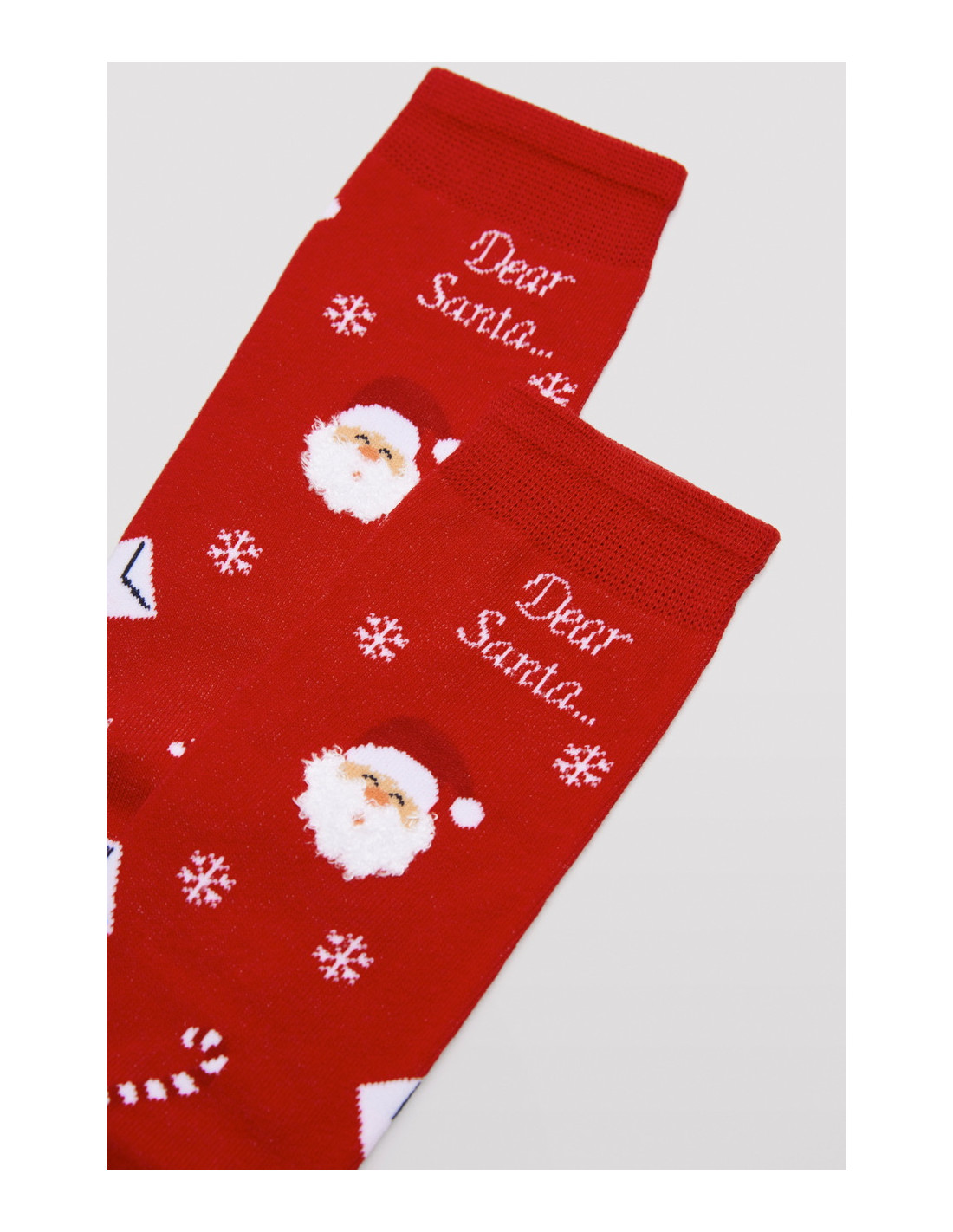 Confeccionados en suave algodón, ofrecen una sensación agradable y cálida al contacto con la piel. Cada par presenta divertidos estampados con motivos navideños sobre fondo rojo, aportando un toque alegre y lleno de color a tus looks de invierno.
