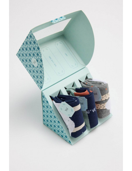 Sorprende con un detalle funcional y con estilo gracias a este pack de 3 calcetines de media caña presentado en una caja regalo exclusiva. Incluye dos pares con diseños estampados modernos y un par con rayas, todos con puño antipresión para un ajuste cómodo sin marcas.
