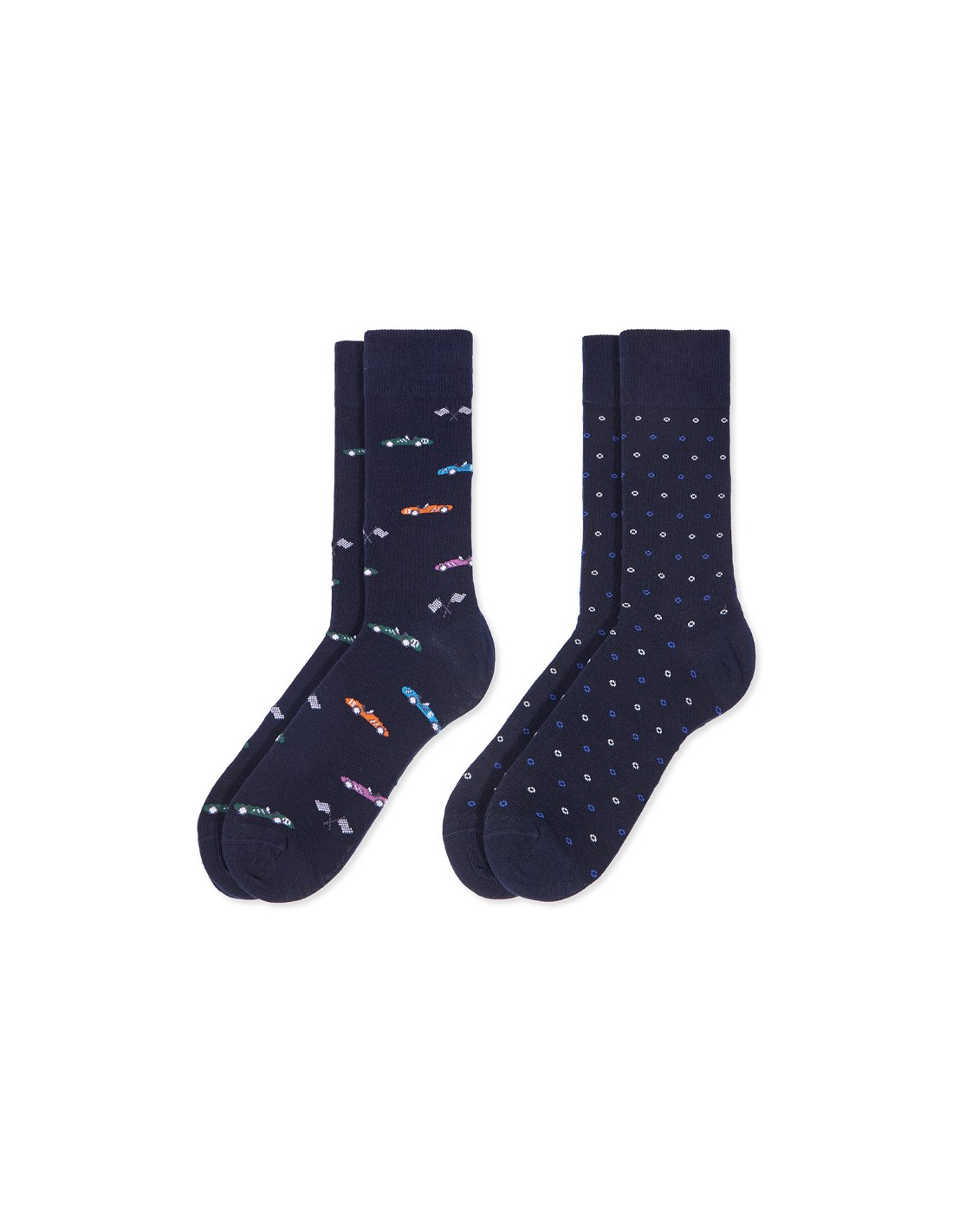 Cada par presenta un estilo único: uno con toques de color en un estampado de coches sobre fondo azul marino, y otro con pequeños círculos en sobre fondo azul marino, ideales para aportar un detalle original y moderno a tu look diario.