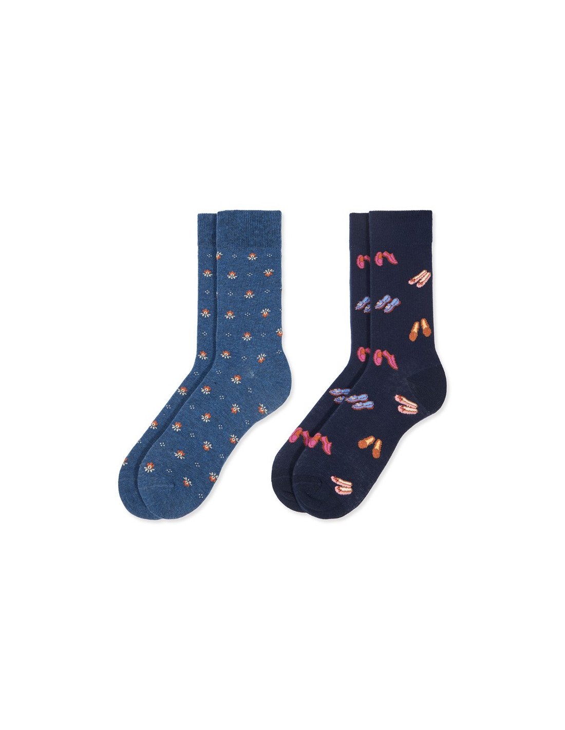 Cada pack incluye dos pares de calcetines remallados a mano y con puño rulo, que se ajustan con suavidad sin oprimir. Presentan diseños originales y divertidos: un par en color azul con pequeñas flores estampadas, y otro en color azul marino con un divertido estampado de zapatos de bailarina.
