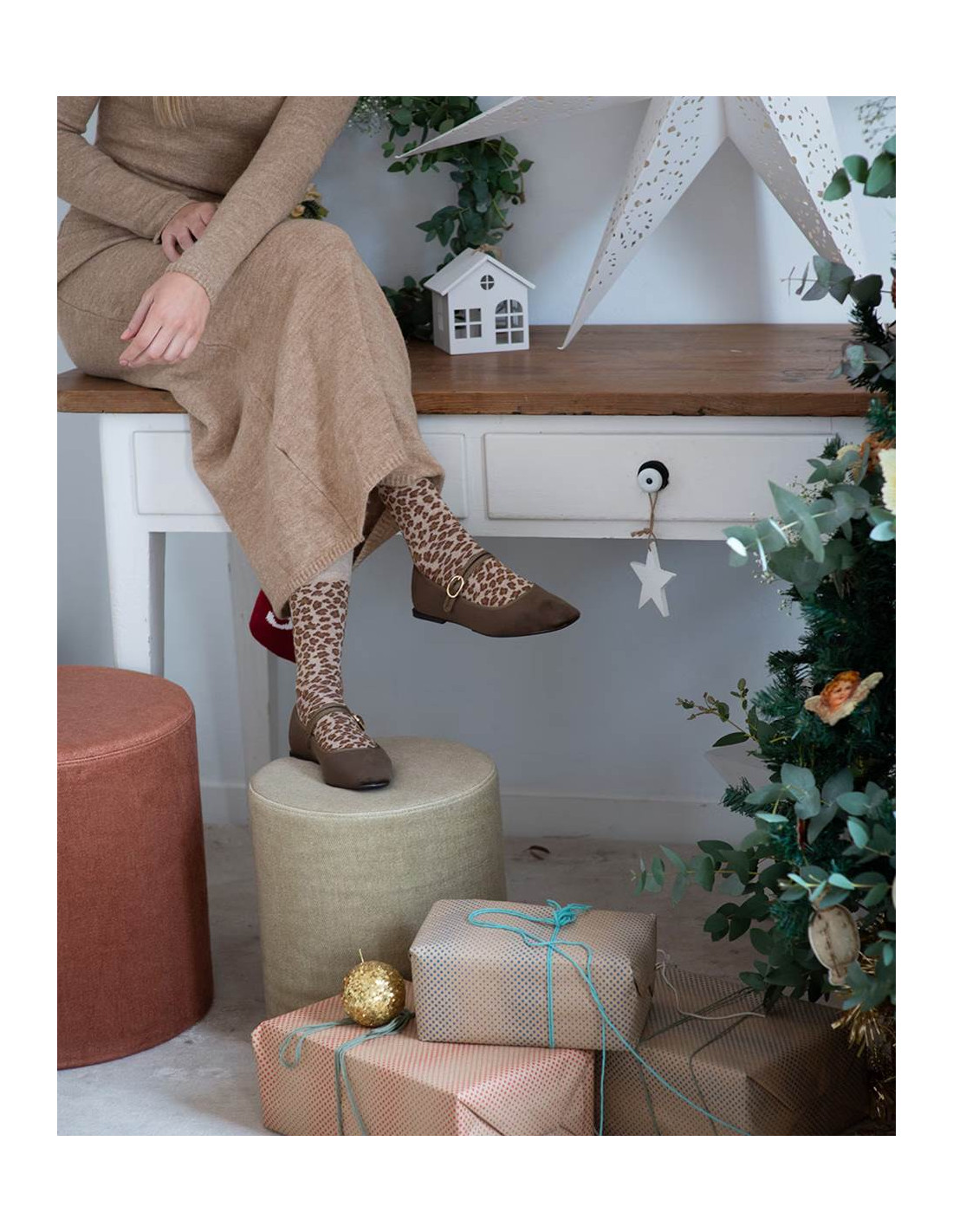 Cada pack incluye dos pares de calcetines media cañaremallados a mano y con puño rulo, que garantiza un ajuste cómodo sin presionar. Presentan diseños estampados animal print, disponibles en tonos marrones y beige o en azules y grises, aportando un toque moderno y elegante a cualquier look.