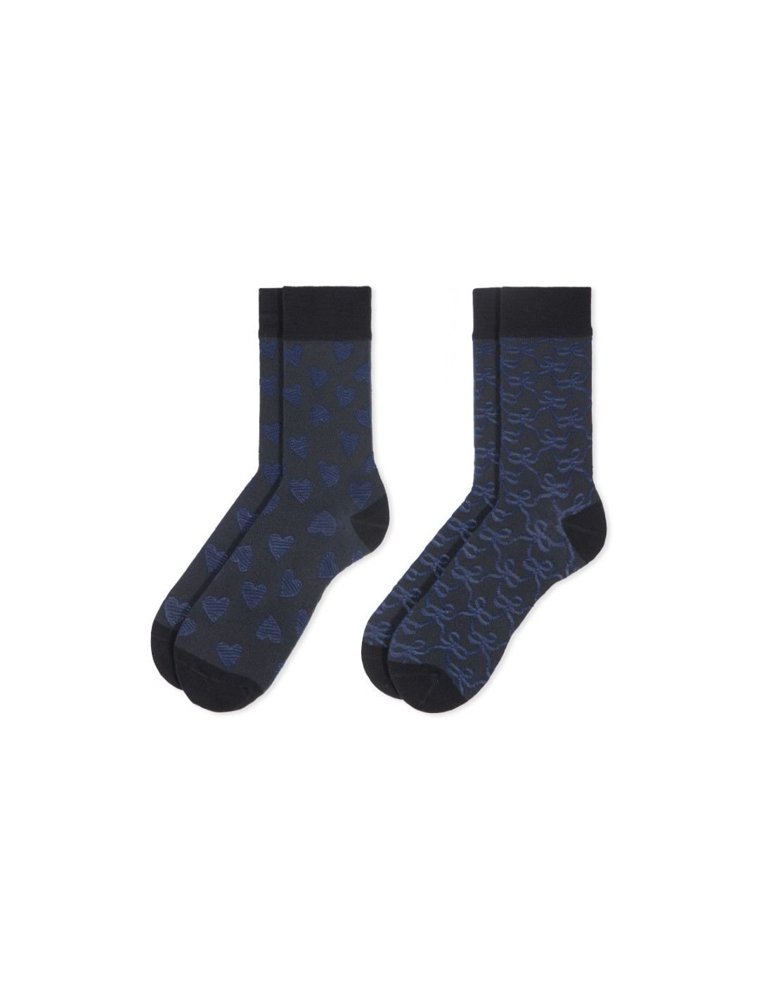 Cada pack incluye dos pares de calcetines remallados a mano y con puño sensitive, que aseguran una sujeción suave sin presión. Un par en color negro con corazones estampados, y otro en color negro también con lazos estampadas en color azul.