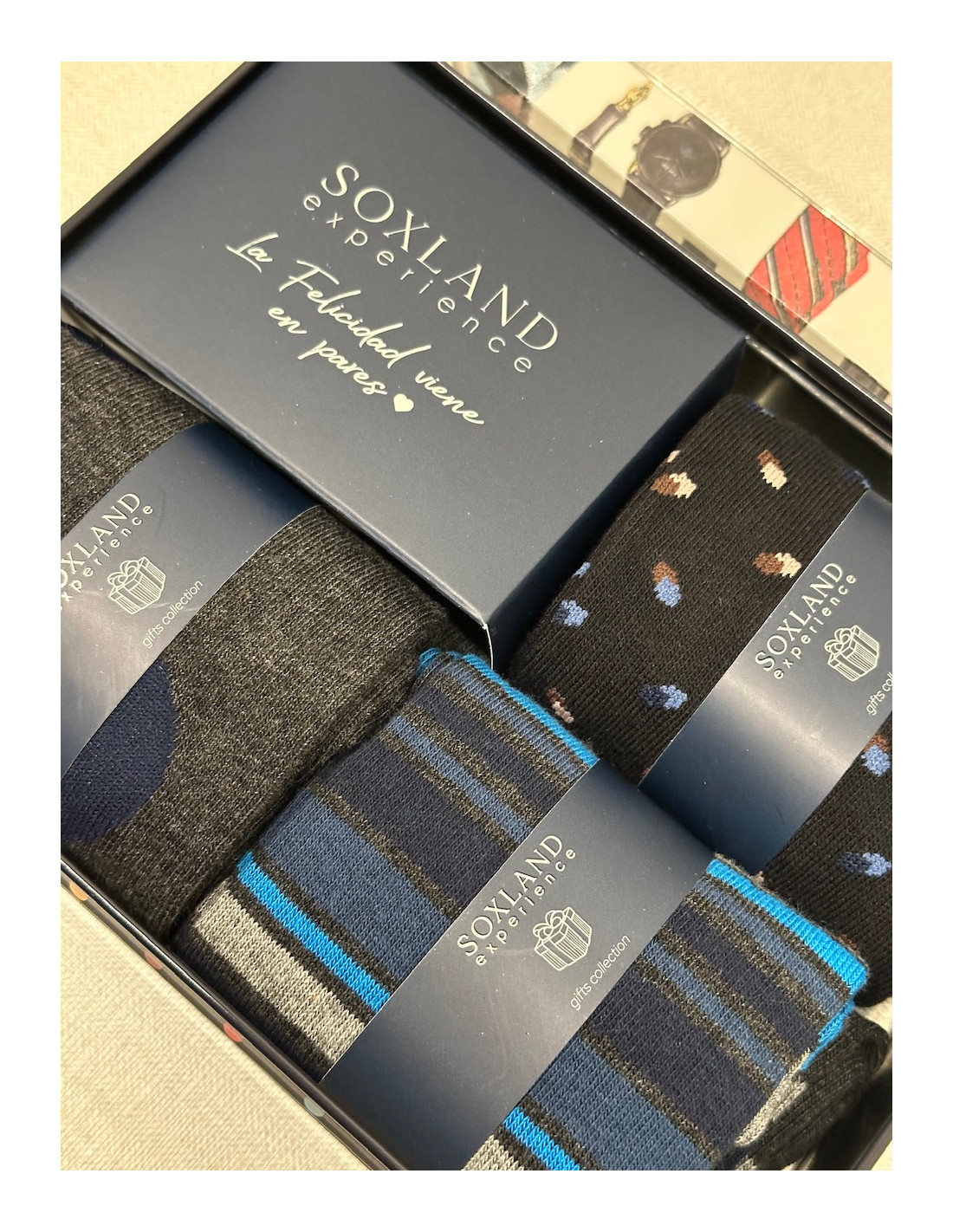 El pack incluye tres pares con diseños estampados discretos y elegantes, presentados en una preciosa caja metálica que los convierte en un regalo perfecto para cualquier ocasión.