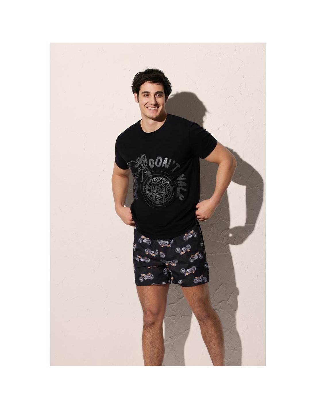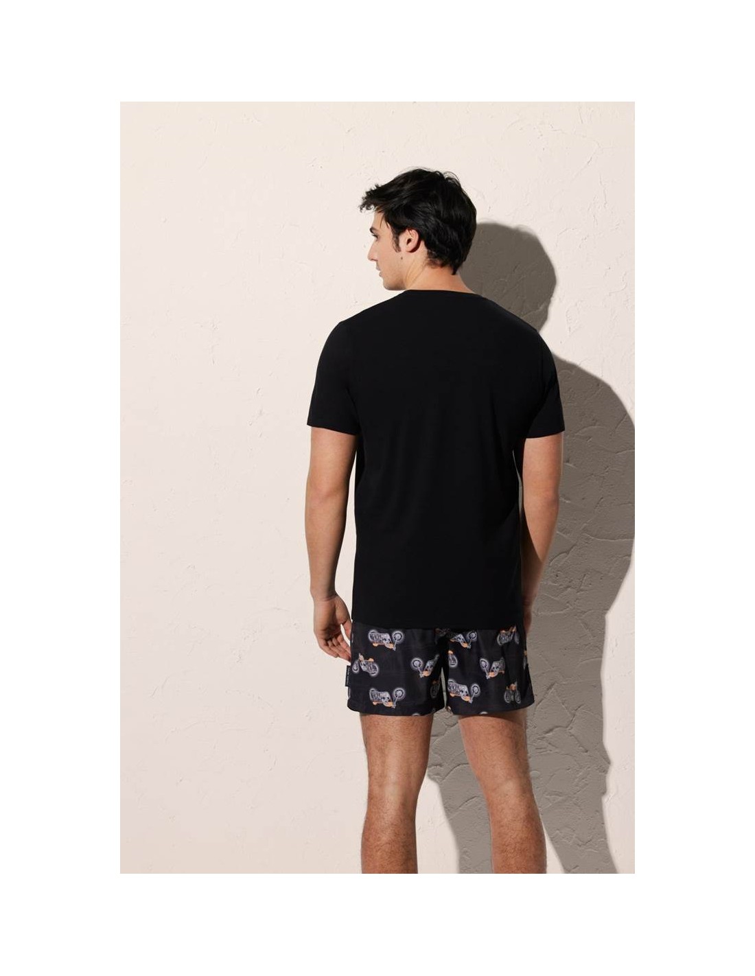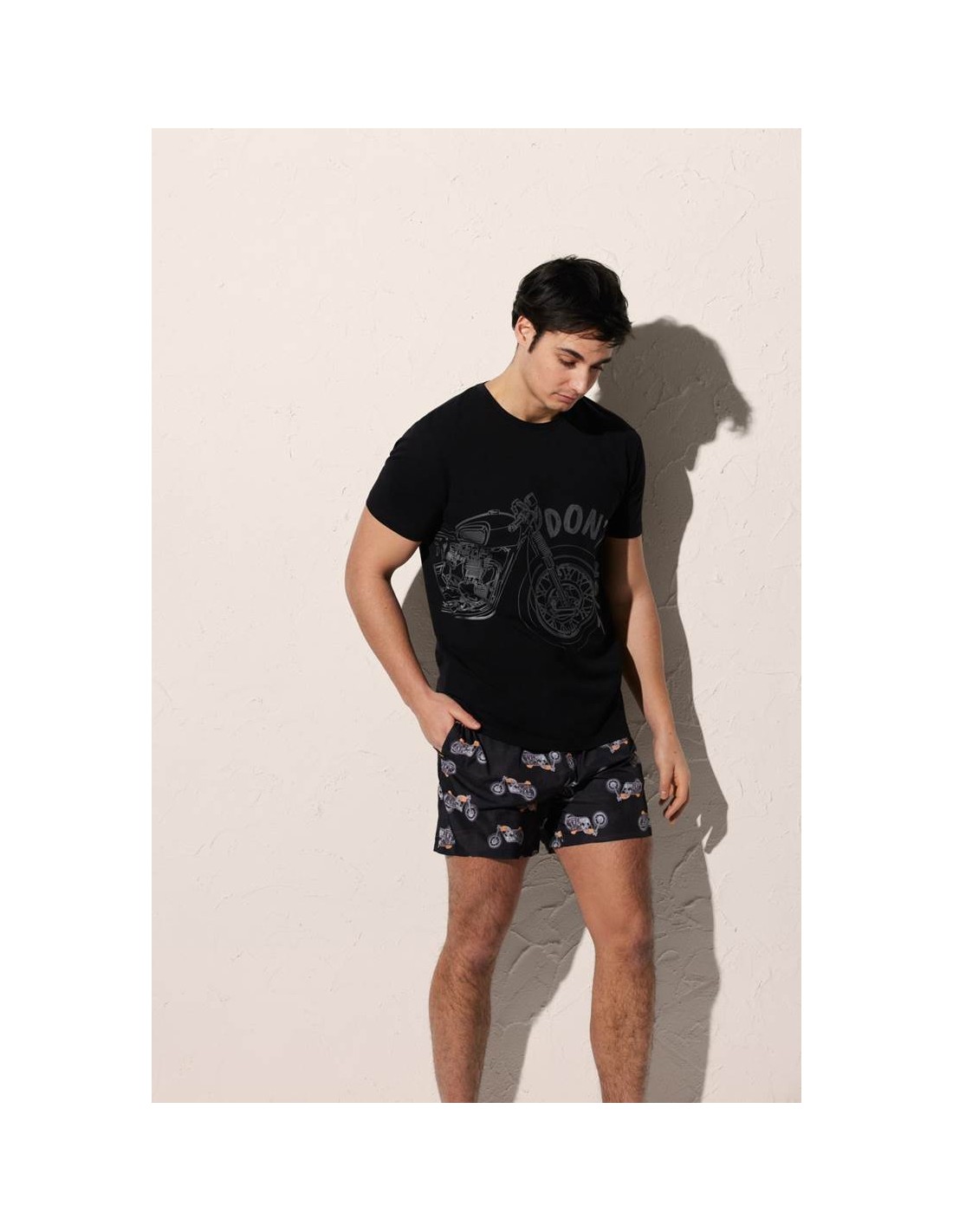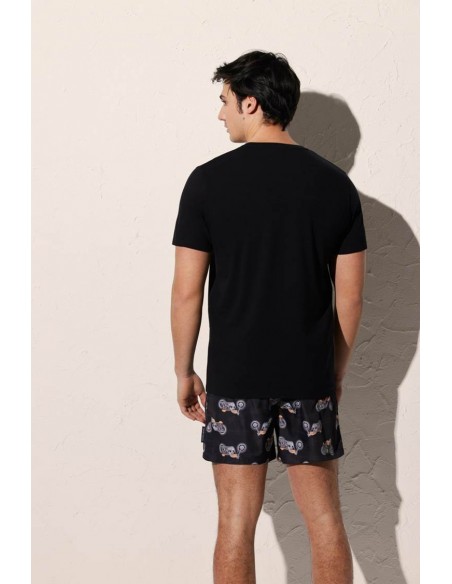 Esta camiseta de manga corta y cuello redondo presenta un atractivo diseño estampado de motos sobre fondo de color negro, aportando un estilo moderno y desenfadado. Su corte regular fit se adapta cómodamente al cuerpo sin resultar demasiado ajustado ni holgado, ofreciendo libertad de movimiento y un ajuste equilibrado.