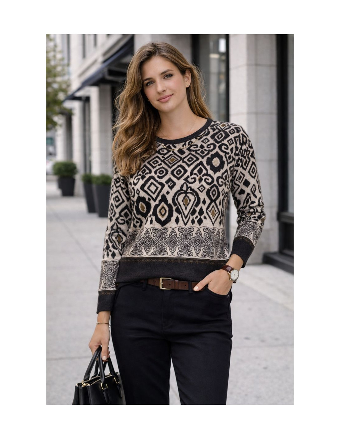 Su diseño de manga larga y cuello redondo se complementa con un elegante estampado abstracto en tonos negros sobre fondo beige, aportando un toque moderno y sofisticado. Una prenda fácil de combinar, ideal tanto para outfits casuales como para looks más cuidados.