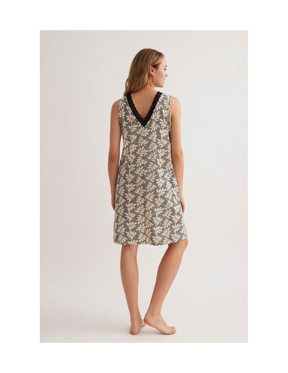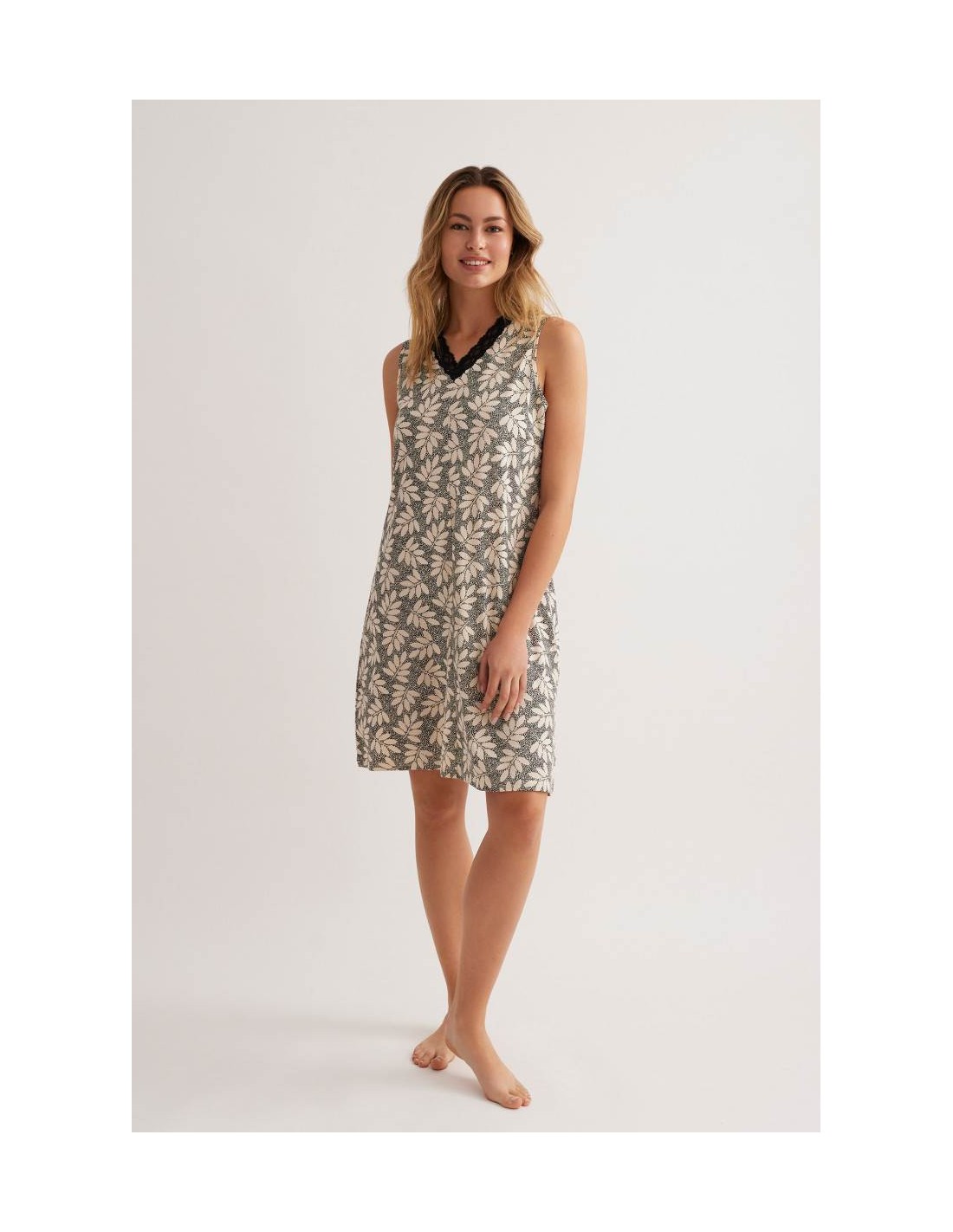 Diseñada con tirantes anchos y un favorecedor escote en pico, incorpora un delicado detalle de puntilla en color negro que aporta un toque elegante y sofisticado. Está confeccionada en suave algodón y presenta un estampado bicolor de hojas, ideal para un look natural y relajado.