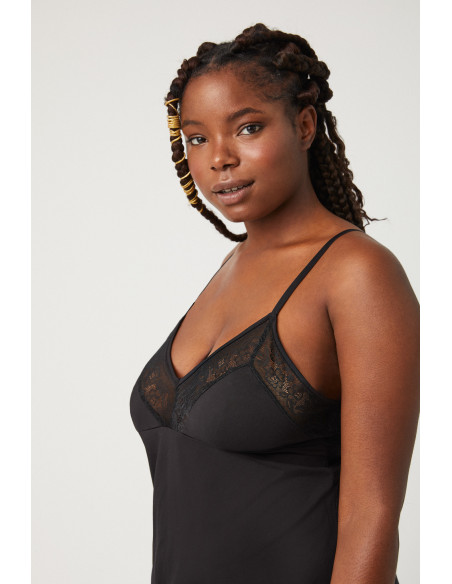 Su diseño lencero con escote en V incorpora aplicaciones de encaje floral, que aportan elegancia y sensualidad, creando un efecto visual que realza la silueta con sutileza y estilo. Los tirantes finos regulables permiten ajustar la altura del camisón según tus preferencias, garantizando un ajuste perfecto y personalizado que se adapta a cada cuerpo.