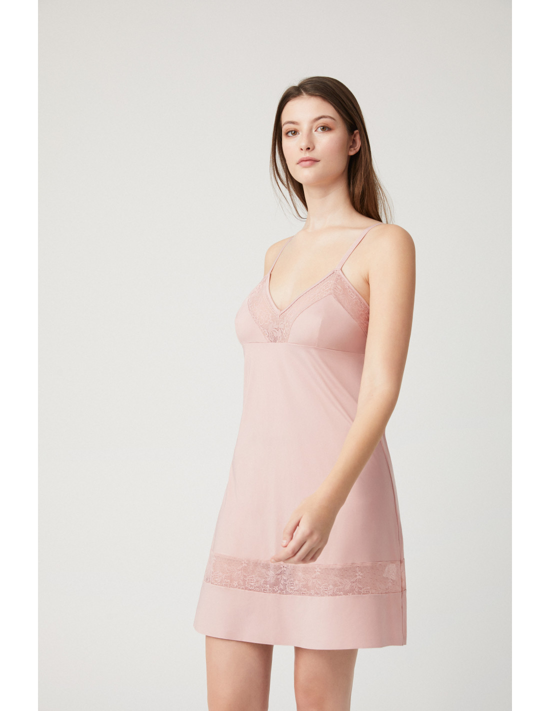 Su diseño lencero con escote en V incorpora aplicaciones de encaje floral, que aportan elegancia y sensualidad, creando un efecto visual que realza la silueta con sutileza y estilo. Los tirantes finos regulables permiten ajustar la altura del camisón según tus preferencias, garantizando un ajuste perfecto y personalizado que se adapta a cada cuerpo.
