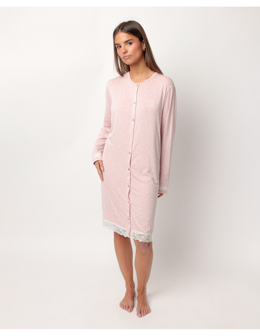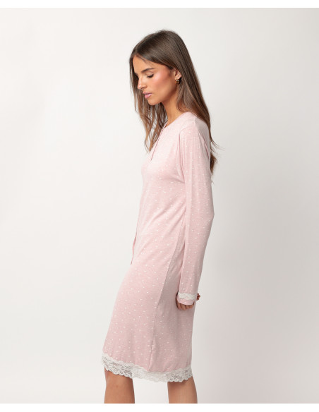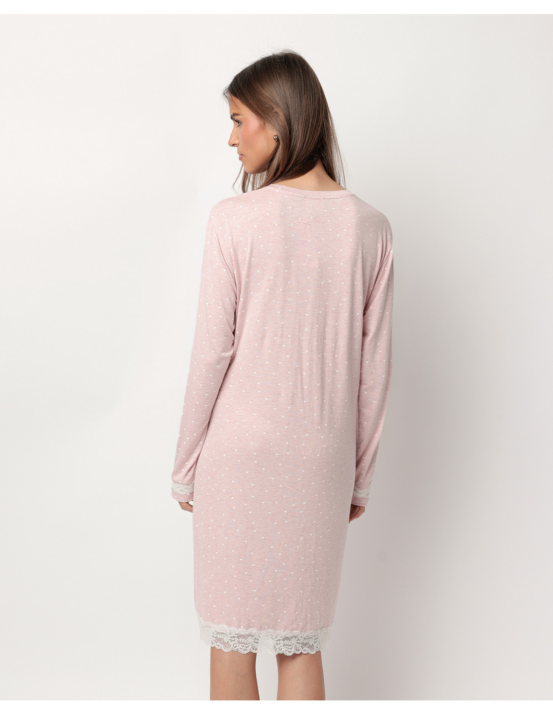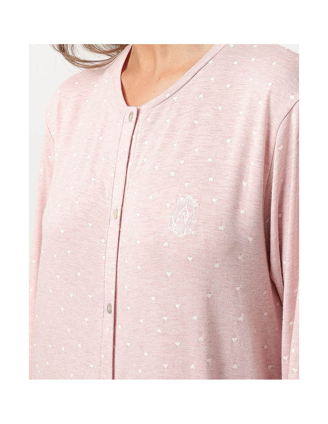 Su diseño incluye manga larga, cuello redondo y cierre frontal con botones, ideal para quienes buscan practicidad sin renunciar al encanto. El estampado de pequeños corazones blancos le da un aire romántico, mientras que los detalles de puntilla, en las mangas y en el bajo, aportan un toque delicado y femenino.