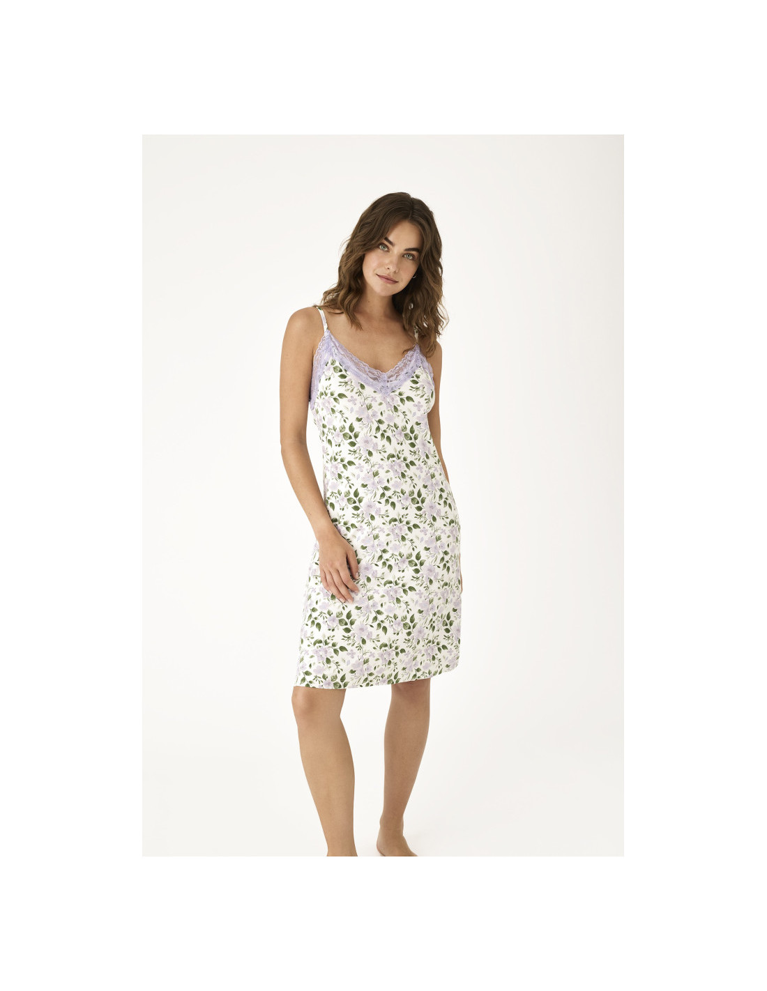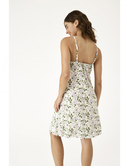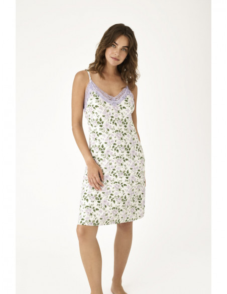 Confeccionada en un suave y ligero tejido de viscosa, presenta un delicado estampado floral en tonos verde y lavanda sobre fondo off white, que aporta frescura y armonía al diseño. Su escote y bajos están realzados con finos detalles de encaje en color lavanda, añadiendo un acabado lencero sofisticado y muy cuidado.