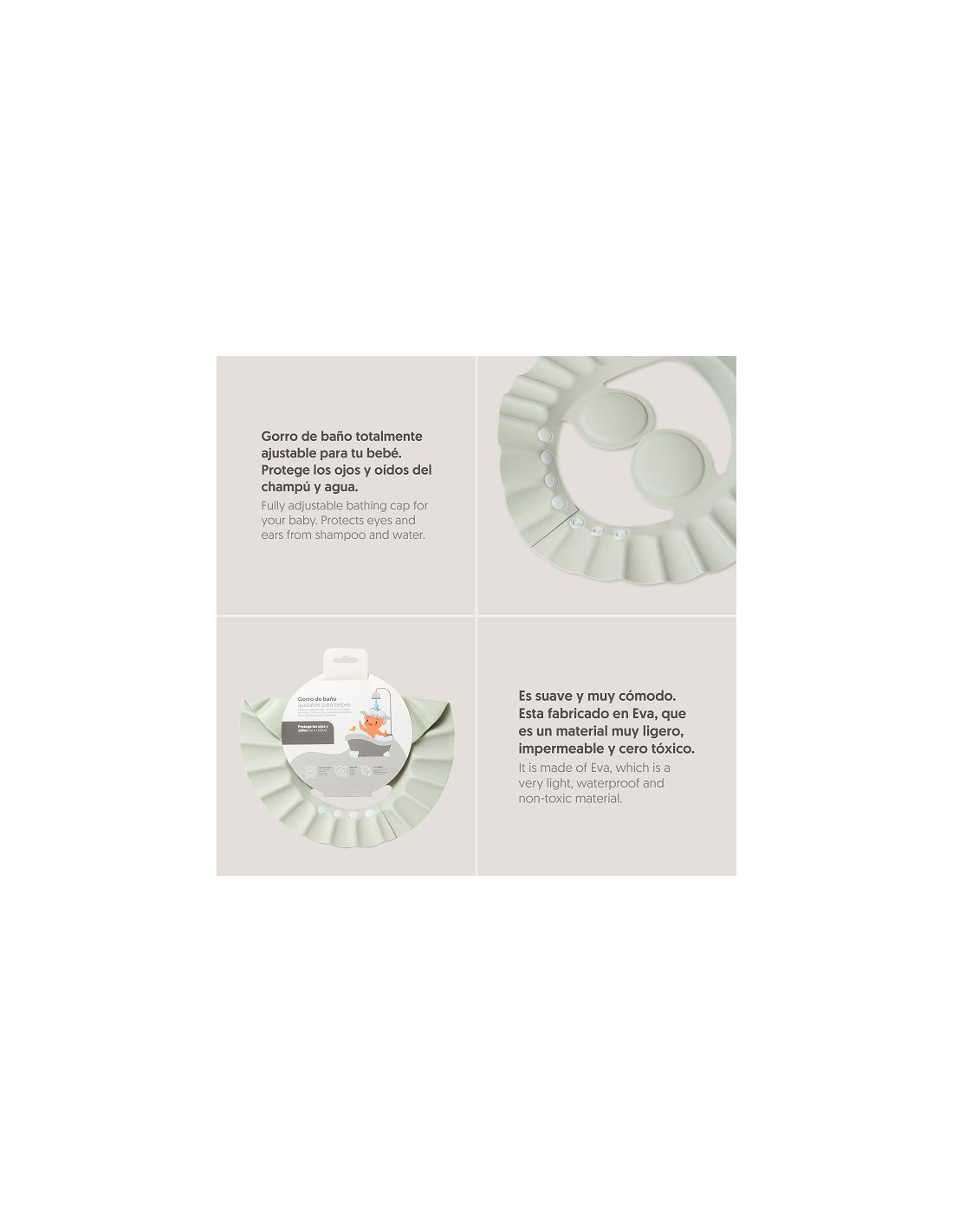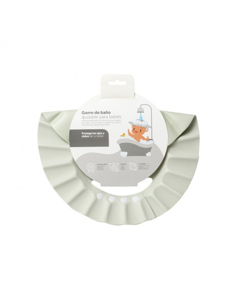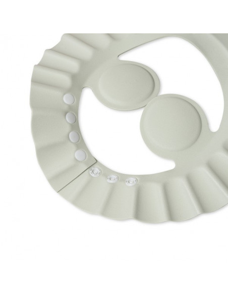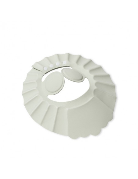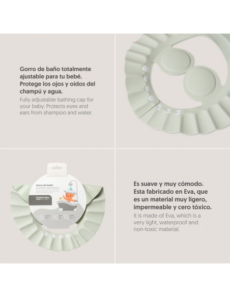Fabricado en EVA, un material ligero, impermeable y libre de tóxicos. Su forma ergonómica protege los ojos y oídos del bebé del contacto con el agua y el champú. Suave, cómodo y totalmente adaptable a la cabeza del niño.