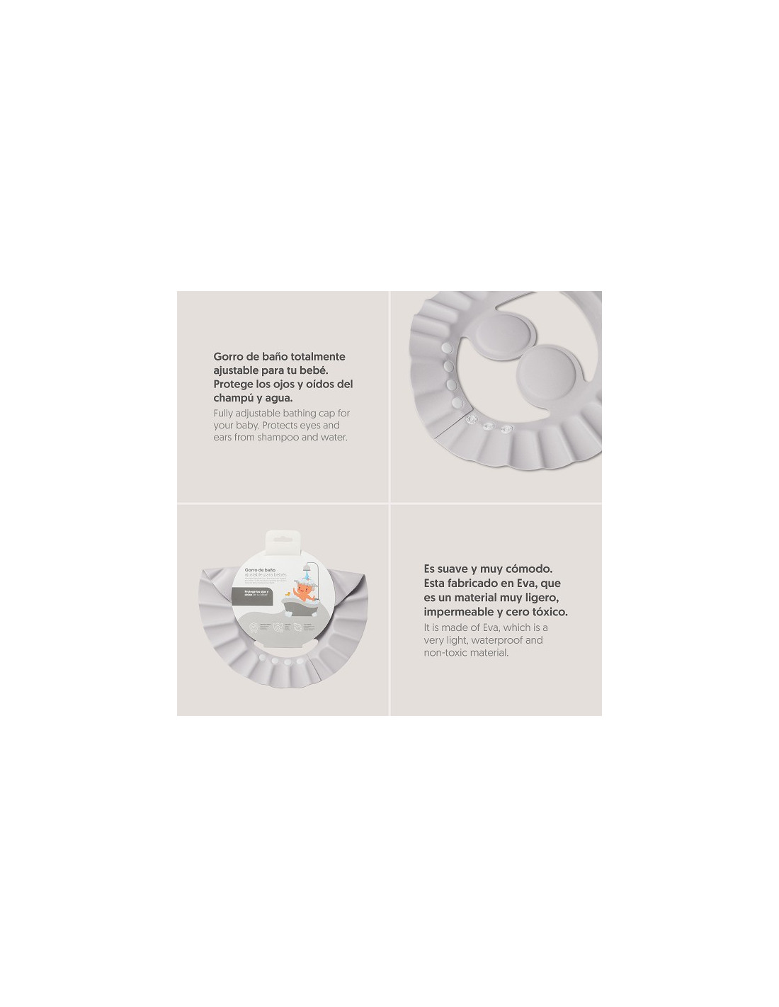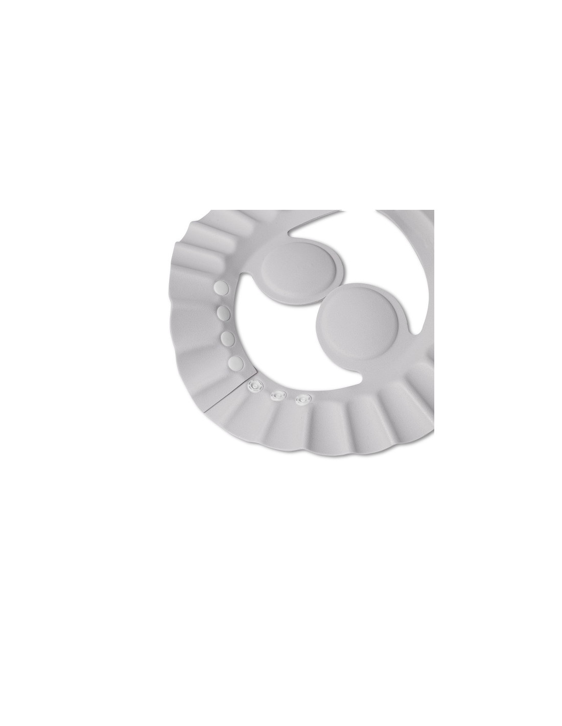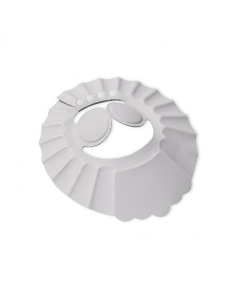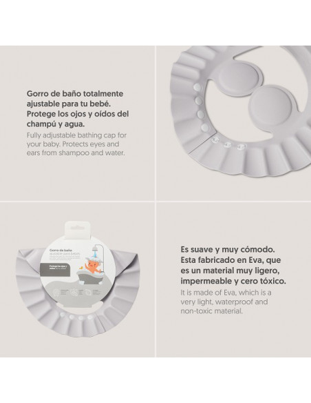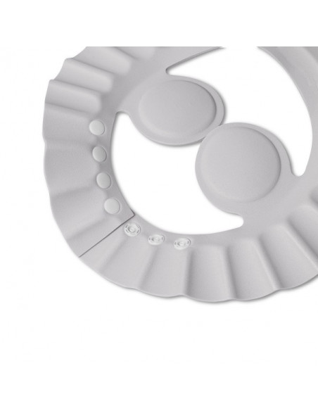 Fabricado en EVA, un material ligero, impermeable y libre de tóxicos. Su forma ergonómica protege los ojos y oídos del bebé del contacto con el agua y el champú. Suave, cómodo y totalmente adaptable a la cabeza del niño.