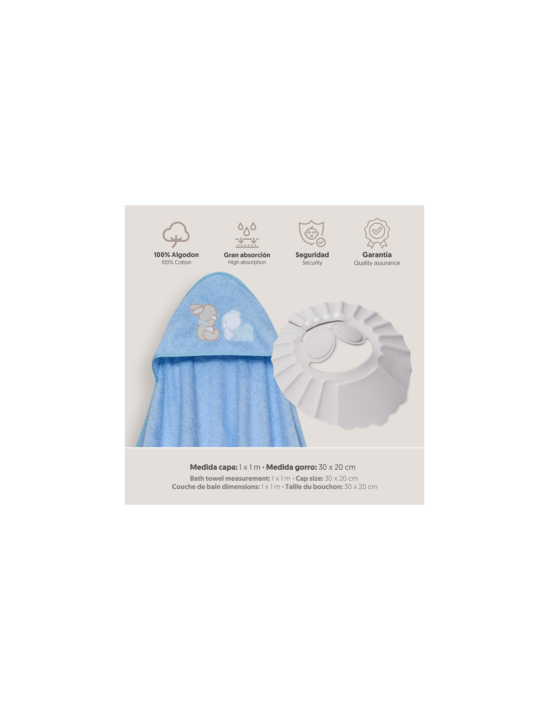 Confeccionada en tejido rizo de 100% algodón, es ultra suave y altamente absorbente, perfecta para mimar la piel delicada de tu bebé. Su diseño encantador en la capucha, con un tierno conejito y osito jugando, le da un toque único y entrañable.