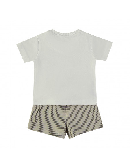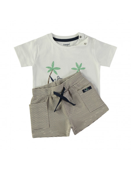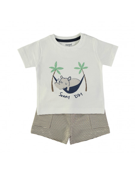 La camiseta de manga corta y cuello redondo presenta un encantador diseño estampado de un rinoceronte descansando en una hamaca, aportando un estilo fresco y divertido. Abertura en el cuello con corchetes. El pantalón corto, confeccionado en el mismo tejido, completa el conjunto con un diseño de rayas horizontales sobre fondo beige, creando un look armonioso y veraniego.