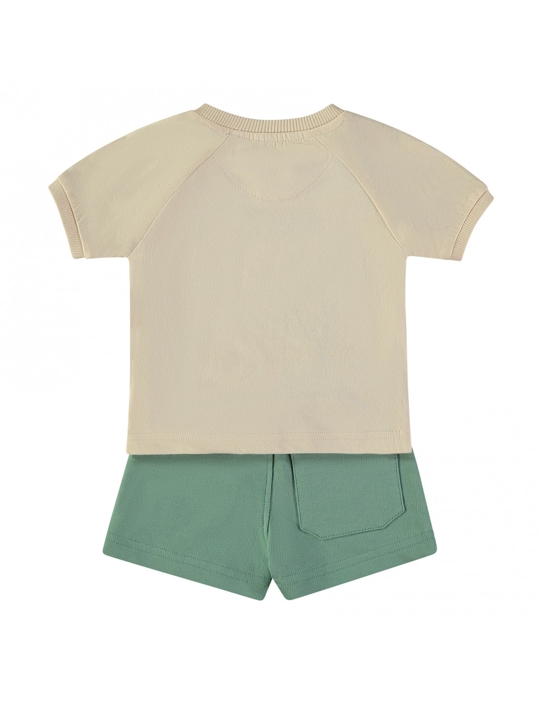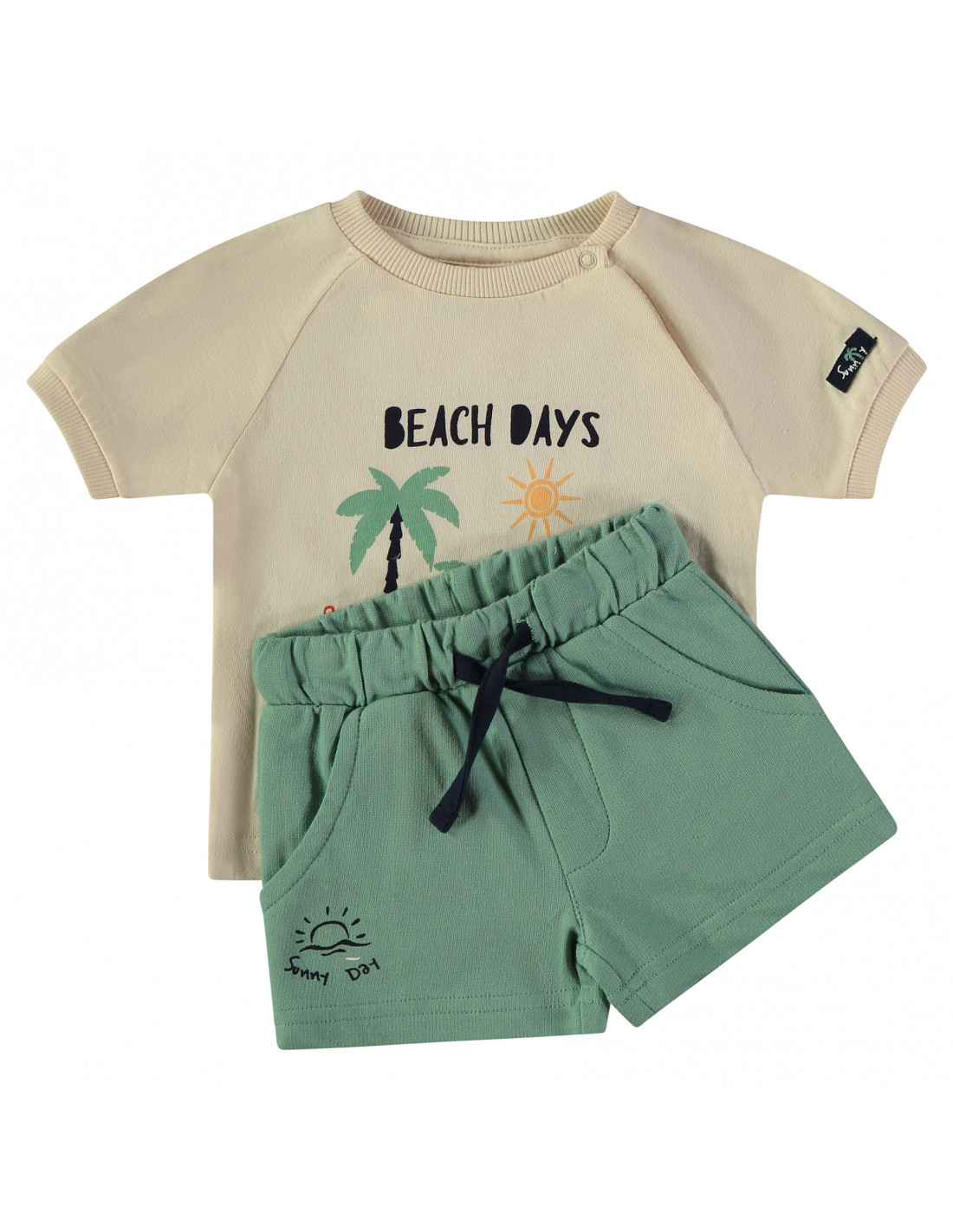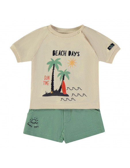 La camiseta de manga corta y cuello redondo presenta un encantador diseño estampado de un día de playa sobre fondo en color beige, aportando un estilo fresco y divertido. Abertura en el cuello con corchetes. El pantalón corto, confeccionado en el mismo tejido, completa el conjunto con un diseño en color verde, creando un look armonioso y veraniego.