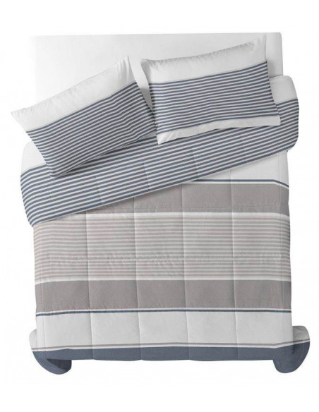 Aporta estilo y calidez a tu dormitorio con el edredón Belis de Clara Vidal, una prenda que destaca por su diseño estampado a rayas y su guateado a cuadros, que le aporta un acabado elegante con un relieve sutil y un tacto muy agradable.