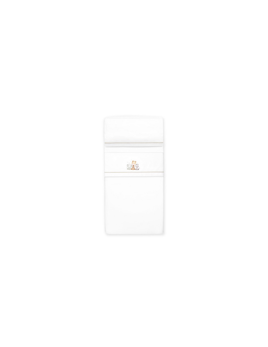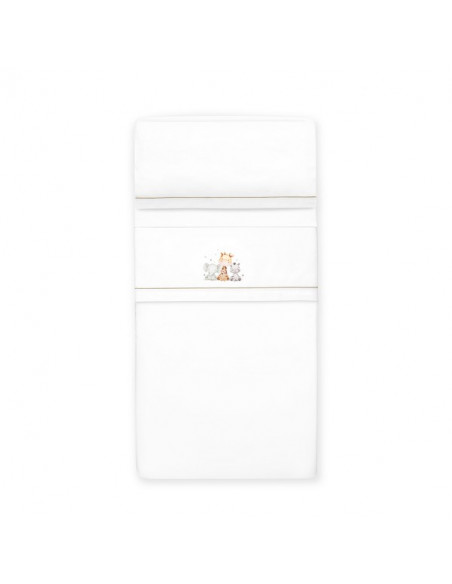 El juego de sábanas está confeccionado en 100% algodón, perfecto para cuidar la piel sensible del bebé. Incluye una sábana bajera ajustable, una sábana encimera y una funda de almohada. Además, el pack incorpora un práctico chupetero con bolitas de silicona, ideal para acompañar al bebé en sus primeros meses.
