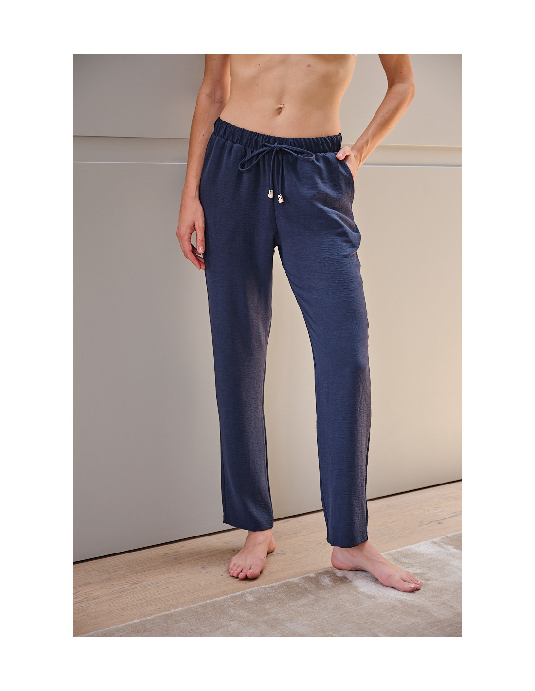 Este pantalón largo destaca por su estilo minimalista y su caída fluida, ideal para un look cómodo y relajado. Con un diseño recto y limpio, presenta una cintura elástica con cordón ajustable, que permite adaptarlo fácilmente al cuerpo y aporta un extra de comodidad en el día a día.