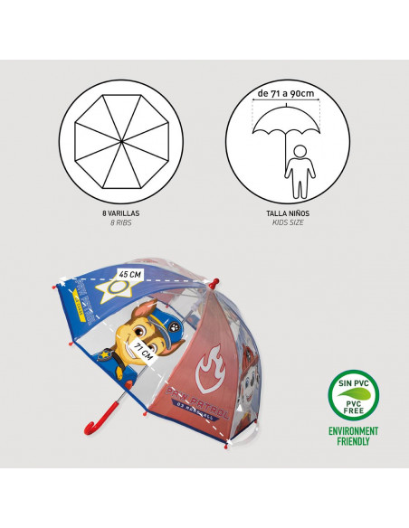 Con una estructura de ocho varillas de fibra de vidrio de alta resistencia y apertura manual, ofrece una gran durabilidad sin renunciar a la ligereza. Su fondo transparente facilita la visibilidad mientras protege de la lluvia, y su estampado de Patrulla Canina lo convierte en el accesorio perfecto para los días de lluvia.