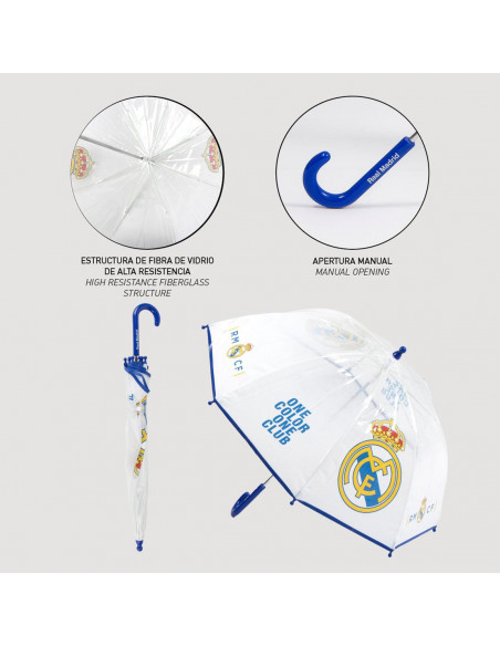 El estampado oficial del Real Madrid añade el toque final: un diseño llamativo y deportivo que hará que cada paseo bajo la lluvia sea especial.