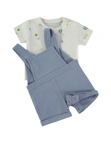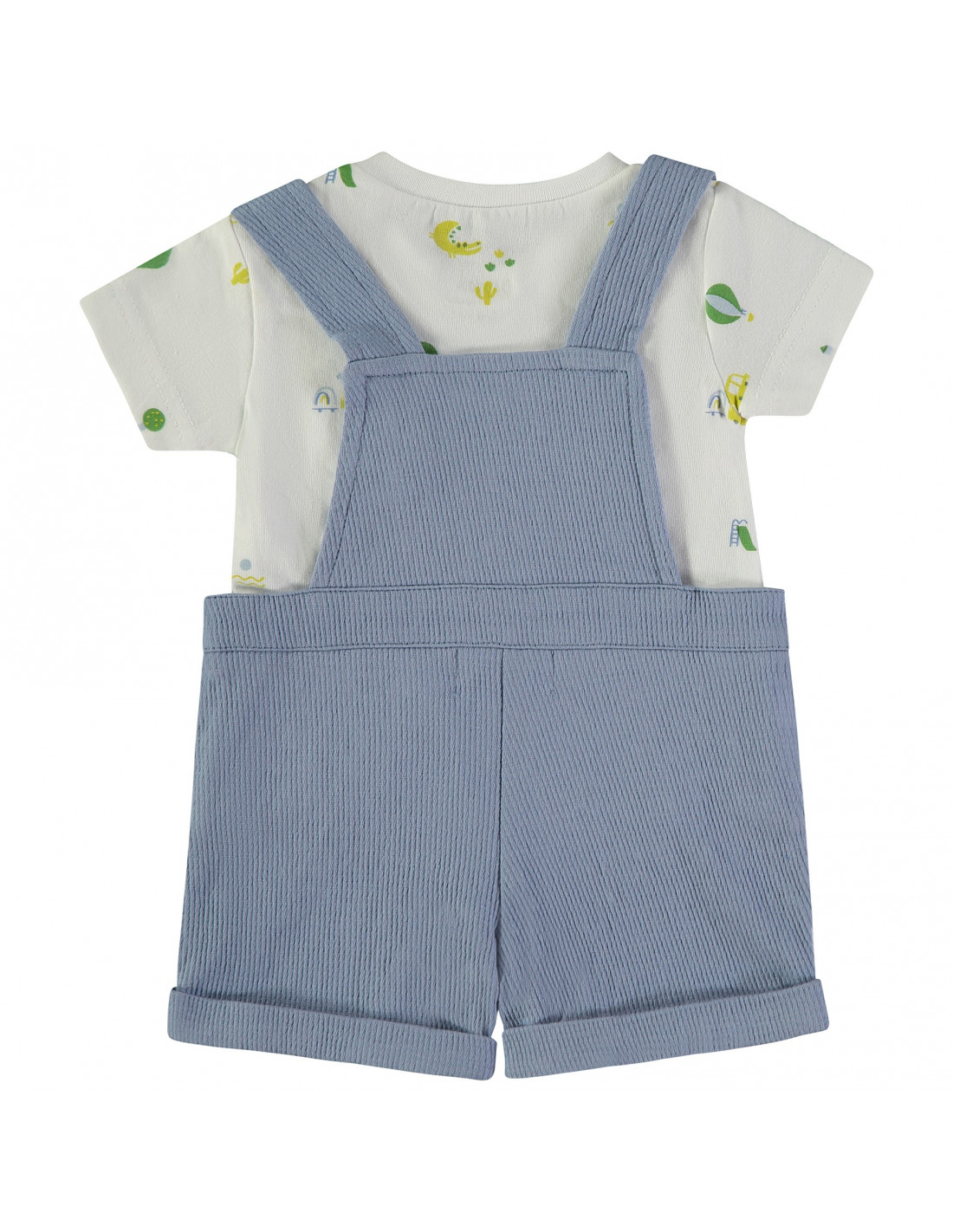 Este conjunto de dos piezas incluye una camiseta de manga corta y cuello redondo con diseño estampado de cocodrilos sobre fondo blanco, con cierre mediante corchete que facilita el cambio. Se completa con un peto a juego, confeccionado en el mismo tejido, con un diseño en color azul. El peto incorpora apertura de corchetes en la pierna, aportando mayor comodidad y funcionalidad.