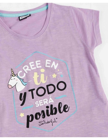 La camiseta de manga corta y cuello redondo está confeccionada en tejido algodón 100%, suave y agradable al tacto, e incorpora un dibujo estampado de unicornios, inspirado en el estilo optimista de Mr. Wonderful. El conjunto se completa con un pantalón corto de estampado de unicornios sobre fondo lila, que incluye cinturilla ajustable para un ajuste cómodo y práctico.