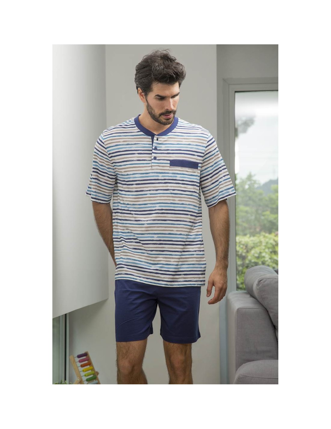 La camiseta de manga corta presenta un diseño de rayas multicolor sobre fondo blanco, acompañado de un cuello redondo abierto con tapeta y botones que aporta un toque clásico y práctico. El pantalón corto, elaborado en el mismo tejido, destaca por su color azul liso y su ajuste cómodo, ideal para moverse con total libertad.