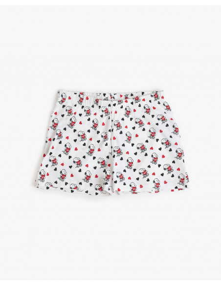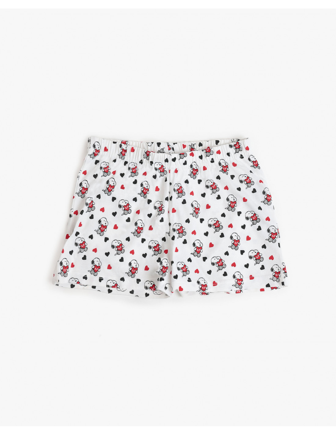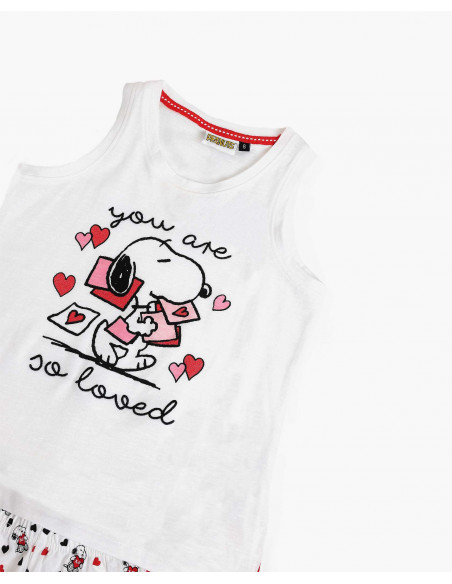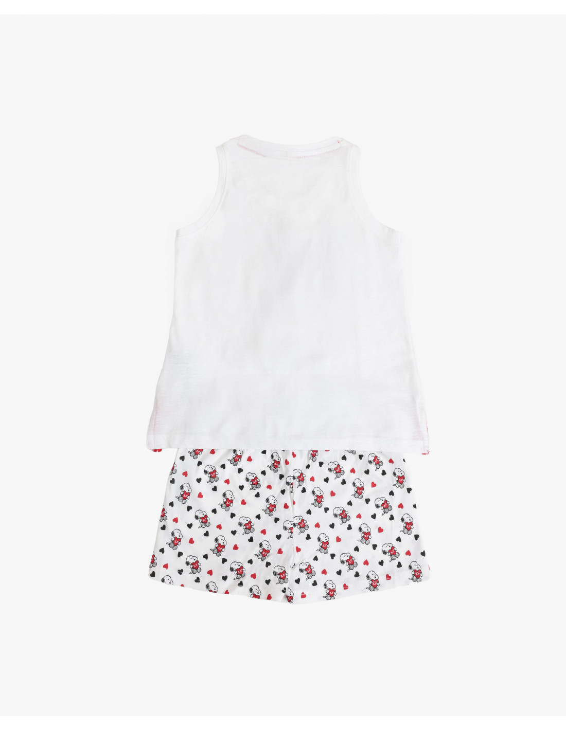 La camiseta de tirantes finos y cuello redondo está confeccionada en suave tejido algodón 100%, con un encantador estampado de Snoopy y detalles en rojo sobre fondo blanco, aportando un toque juvenil y alegre. El conjunto se completa con un pantalón corto a juego, también de algodón, con un diseño estampado en varios colores que añade originalidad y dinamismo.