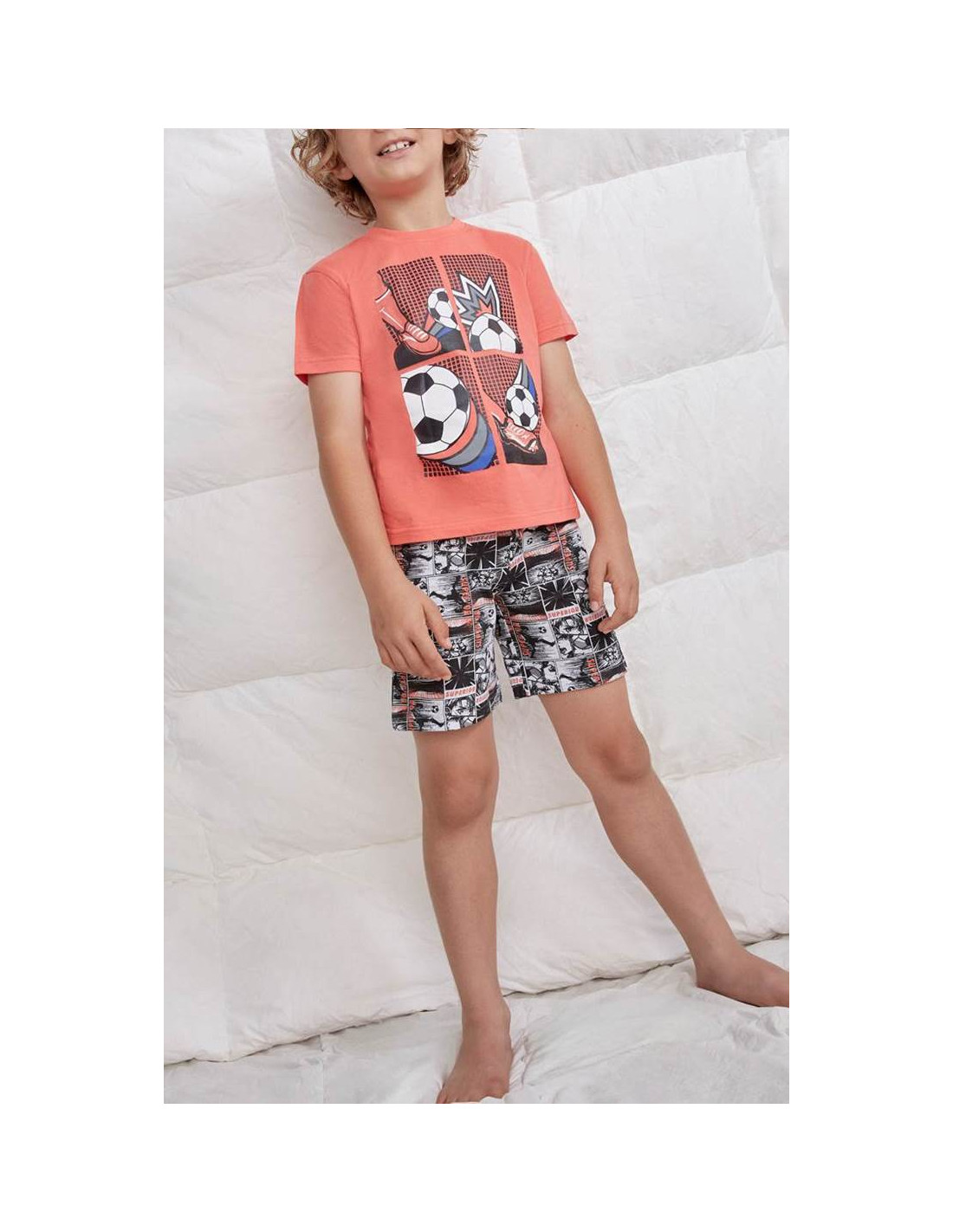 La camiseta de manga corta está confeccionada en un suave tejido de algodón, con cuello redondo y un estampado frontal de balones de fútbol sobre un fondo coral. El pantalón corto, de diseñado tipo comic estampado, está hecho en el mismo material cómodo y cuenta con cintura ajustable para un mejor ajuste.