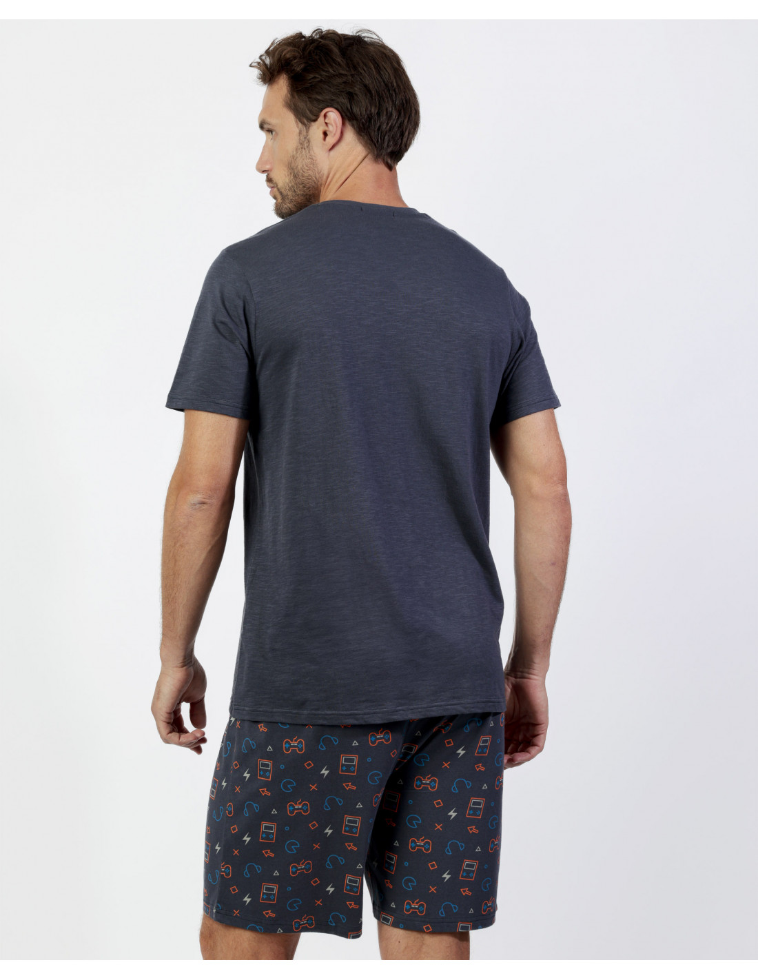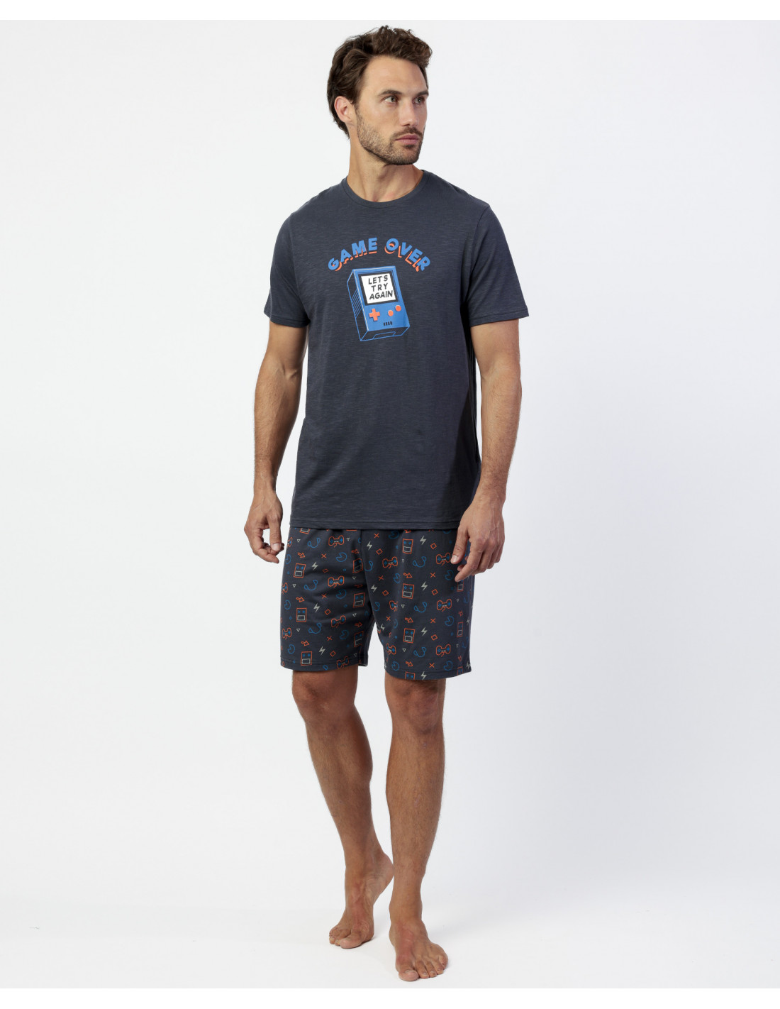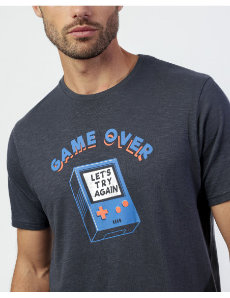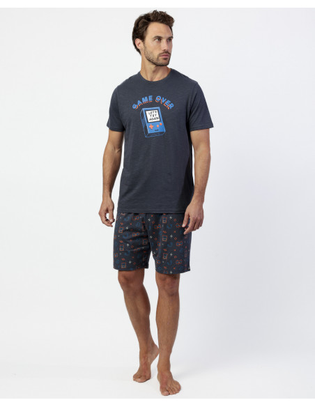 La camiseta de manga corta y cuello redondo presenta un diseño con mensaje “Game Over” y detalles inspirados en videojuegos sobre fondo gris marengo, aportando un estilo juvenil y original. El pantalón corto, confeccionado en el mismo tejido, incluye un estampado a juego sobre fondo gris marengo, además de cinturilla ajustable para mayor comodidad.