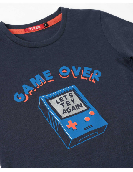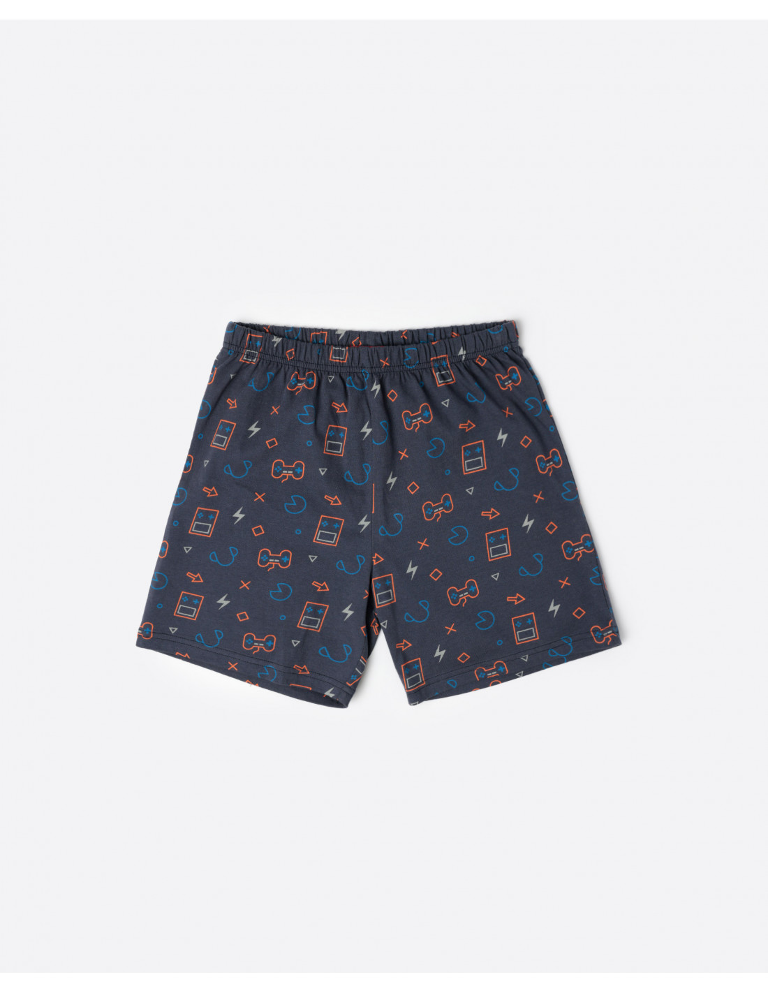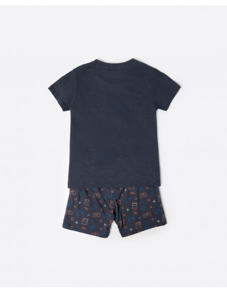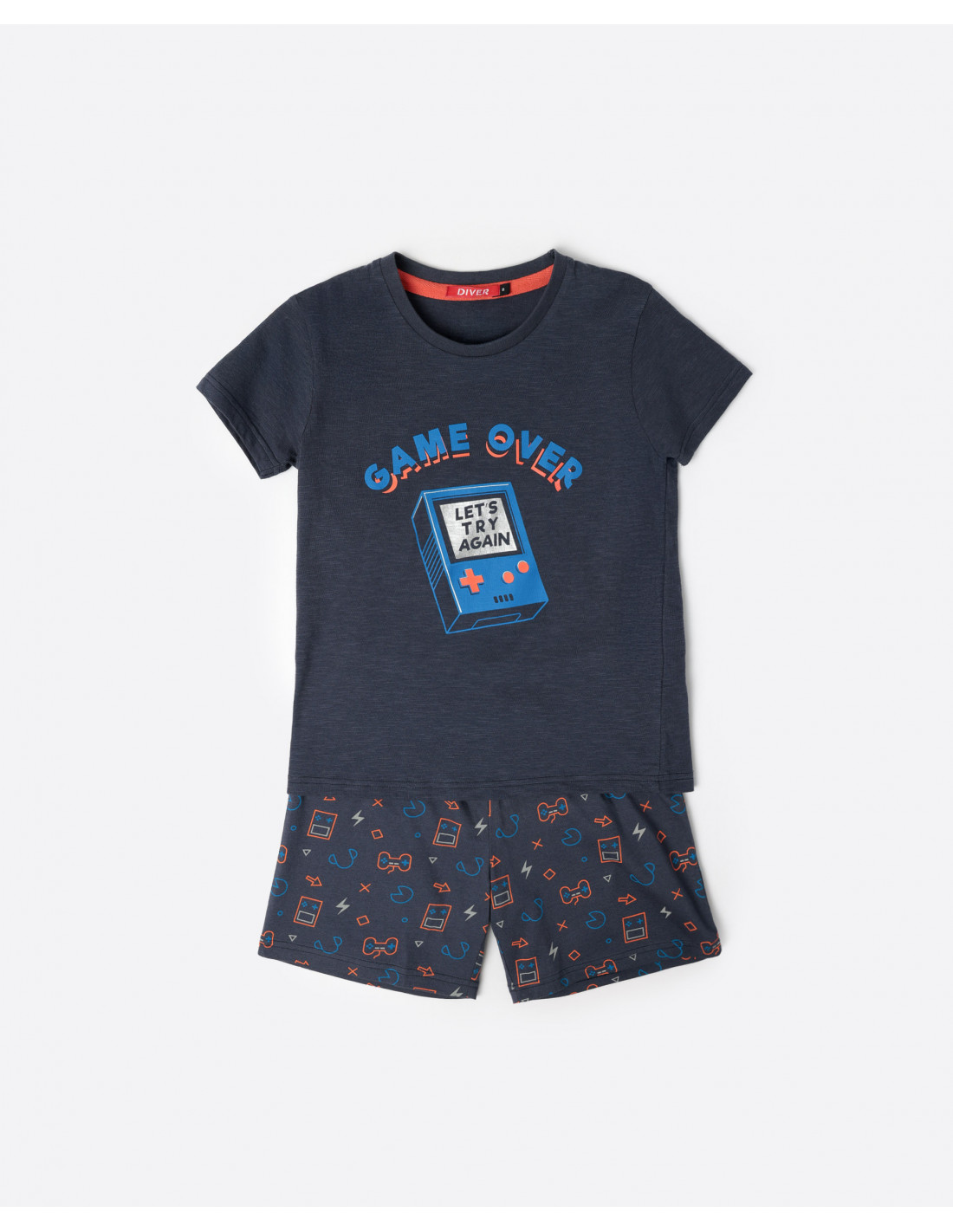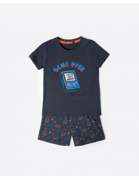 La camiseta de manga corta y cuello redondo presenta un diseño con mensaje “Game Over” y detalles inspirados en videojuegos sobre fondo gris marengo, aportando un estilo juvenil y original. El pantalón corto, confeccionado en el mismo tejido, incluye un estampado a juego sobre fondo gris marengo, además de cinturilla ajustable para mayor comodidad.
