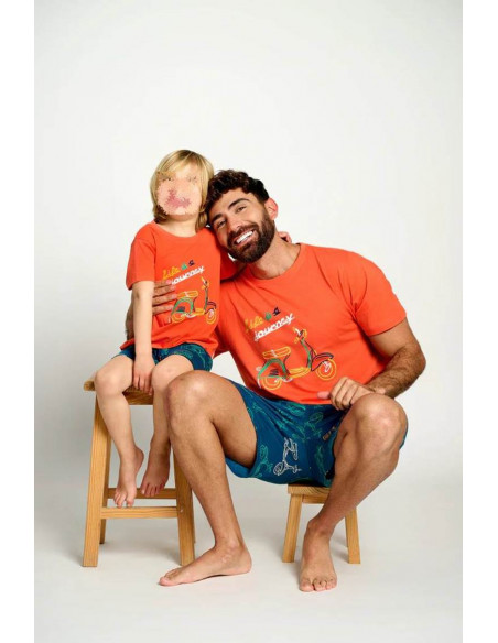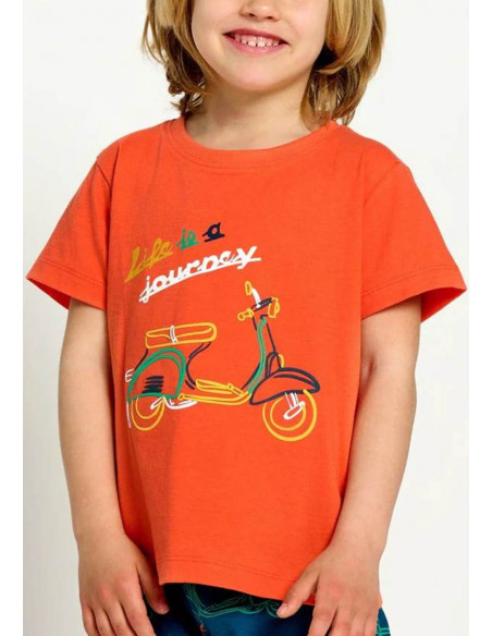 La camiseta de manga corta y cuello redondo está confeccionada en tejido 100% algodón, ofreciendo una sensación suave y transpirable. Presenta un estampado de una moto Vespa sobre fondo naranja, que aporta un toque divertido y lleno de personalidad.