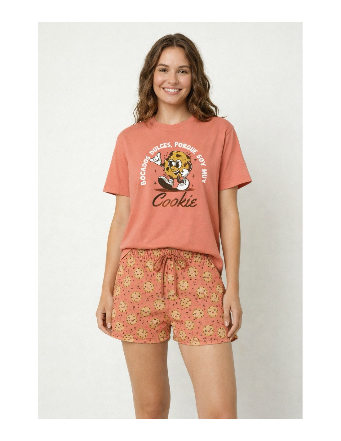 La camiseta de manga corta y cuello redondo está confeccionada en un suave tejido de algodón, con un original estampado de galletas que aporta un estilo alegre y juvenil. El conjunto se completa con un pantalón corto a juego, elaborado en el mismo tejido, con estampado de cookies, cinturilla elástica y cordón ajustable para un ajuste perfecto.