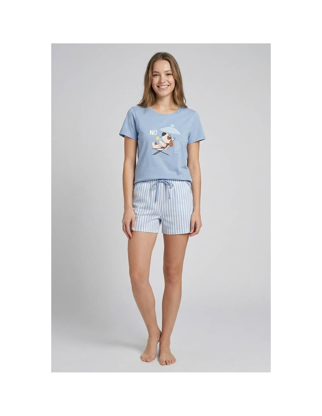 La camiseta de manga corta y cuello redondo está confeccionada en un suave tejido modal, con un original estampado de un perrito en una hamaca sobre fondo liso. El conjunto se completa con un pantalón corto a juego, elaborado en el mismo tejido, con un diseño estampado de rayas verticales, cinturilla elástica y cordón ajustable para un ajuste perfecto.