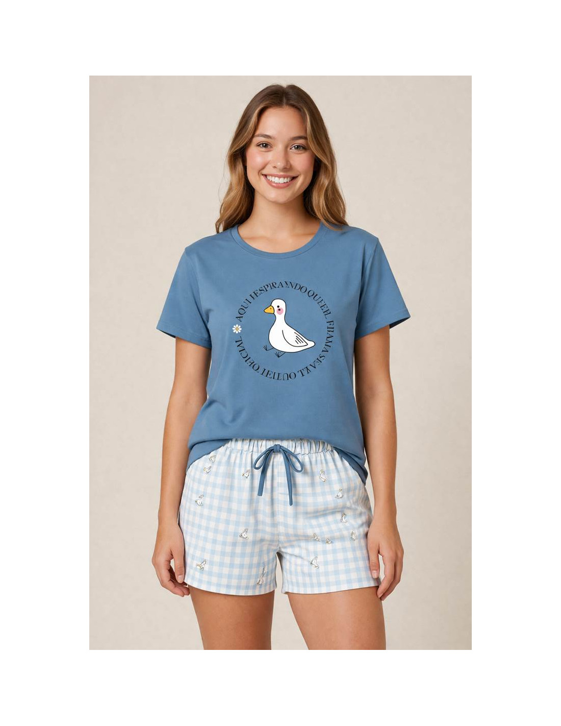 La camiseta de manga corta y cuello redondo está confeccionada en un suave tejido de algodón, con un original estampado de patitos que aporta un estilo alegre y juvenil. El conjunto se completa con un pantalón corto a juego, elaborado en el mismo tejido, con un diseño estampado de cuadros con pequeños patitos, cinturilla elástica y cordón ajustable para un ajuste perfecto.