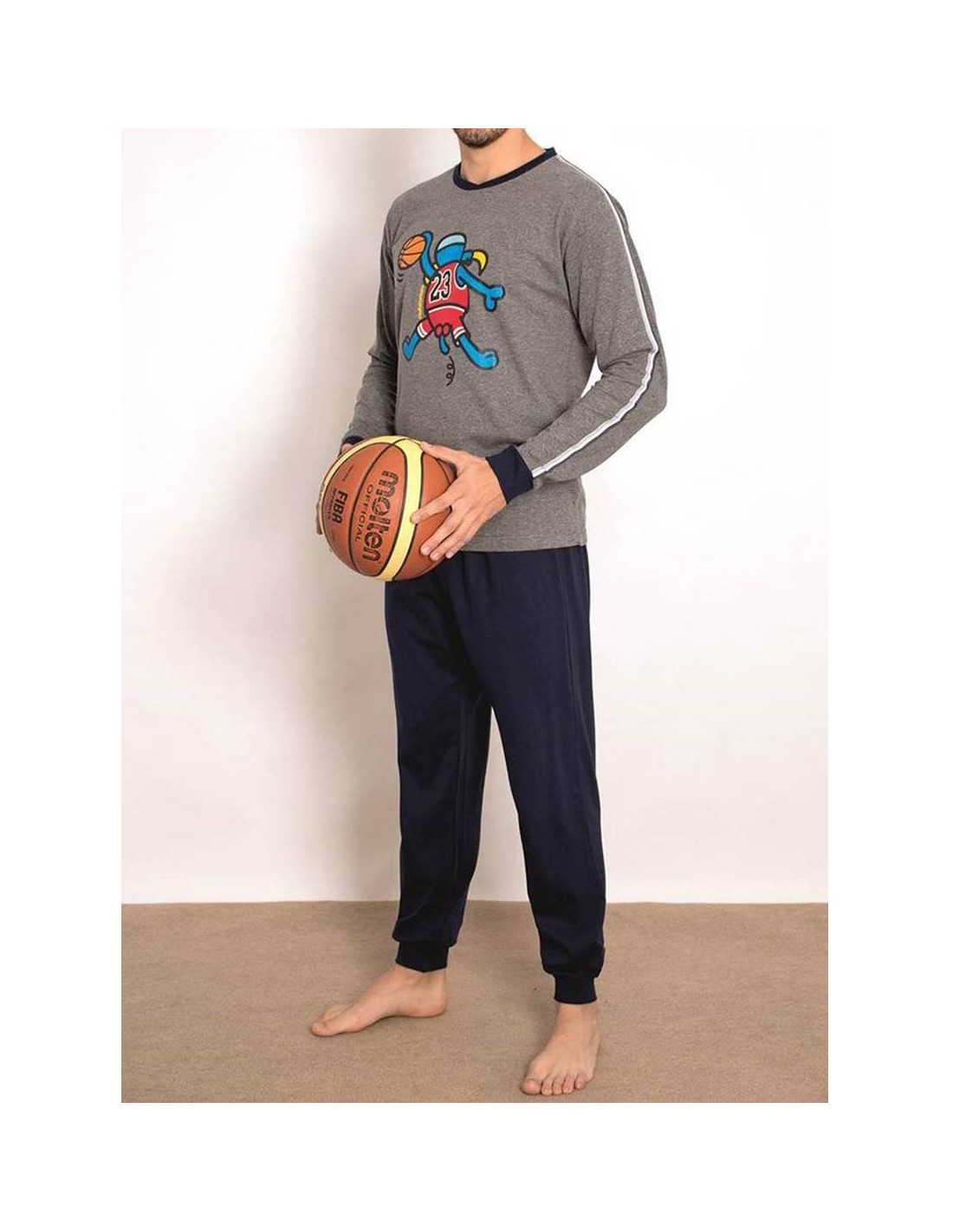 La camiseta de manga larga y cuello redondo está confeccionada en algodón, con un diseño estampado de baloncesto sobre fondo gris marengo que aporta un toque moderno y desenfadado. Su tejido confortable garantiza calidez y libertad de movimiento durante toda la noche.
