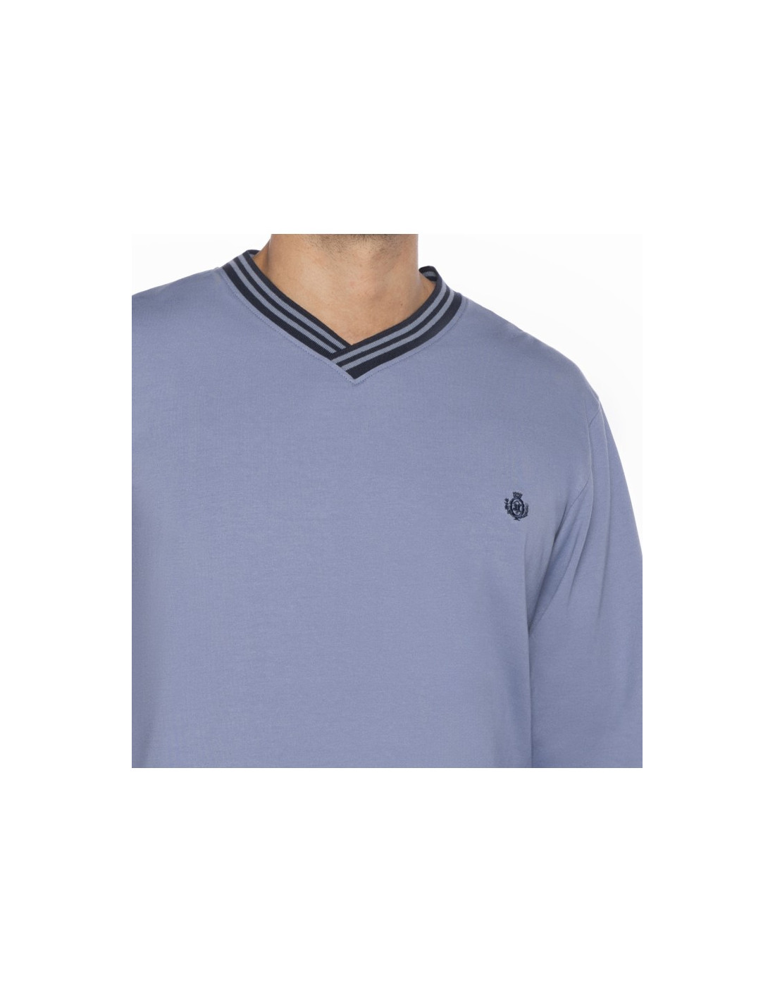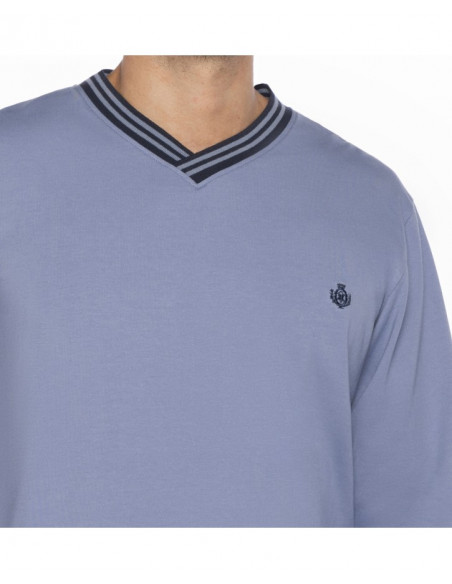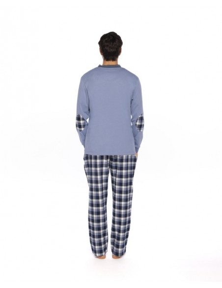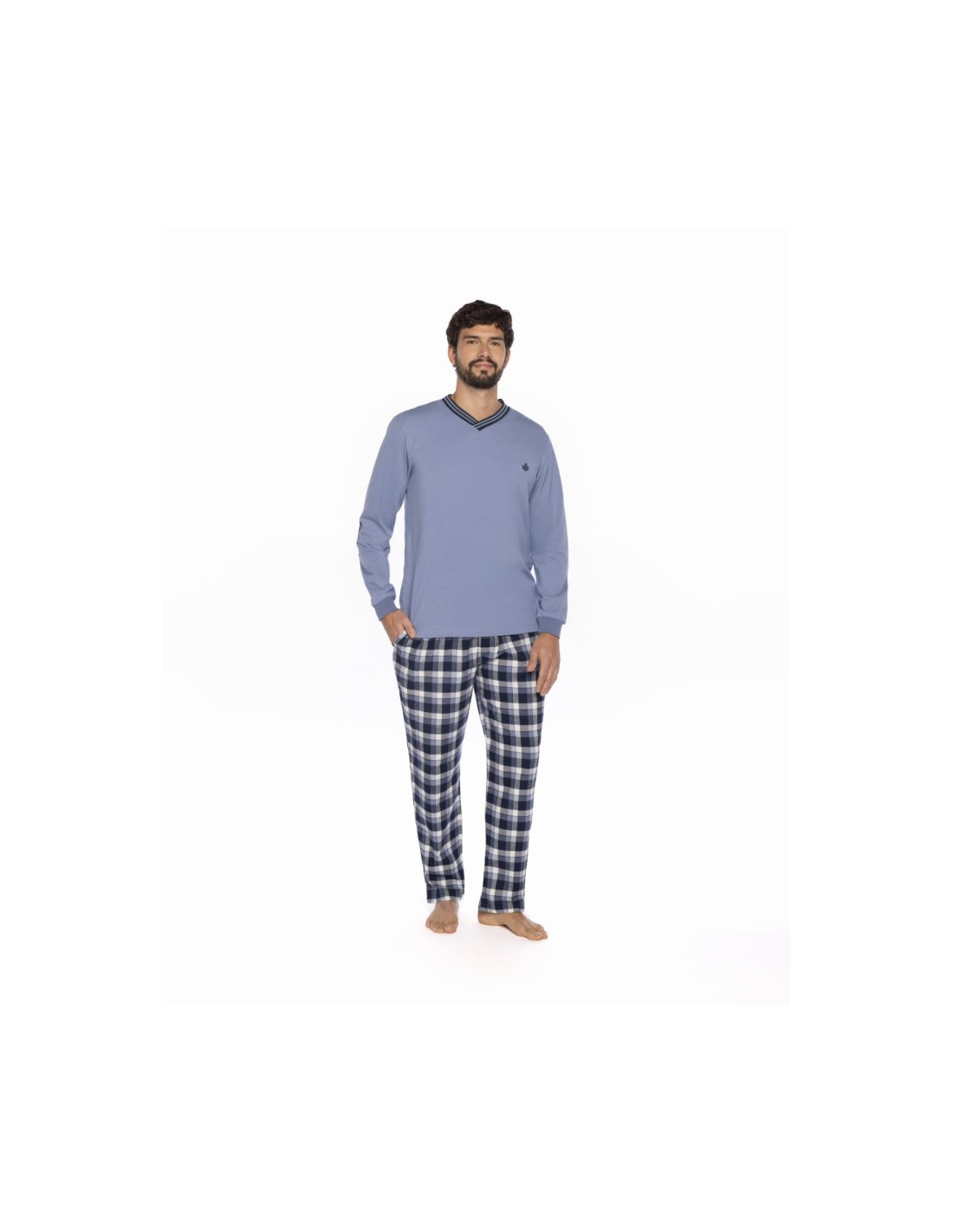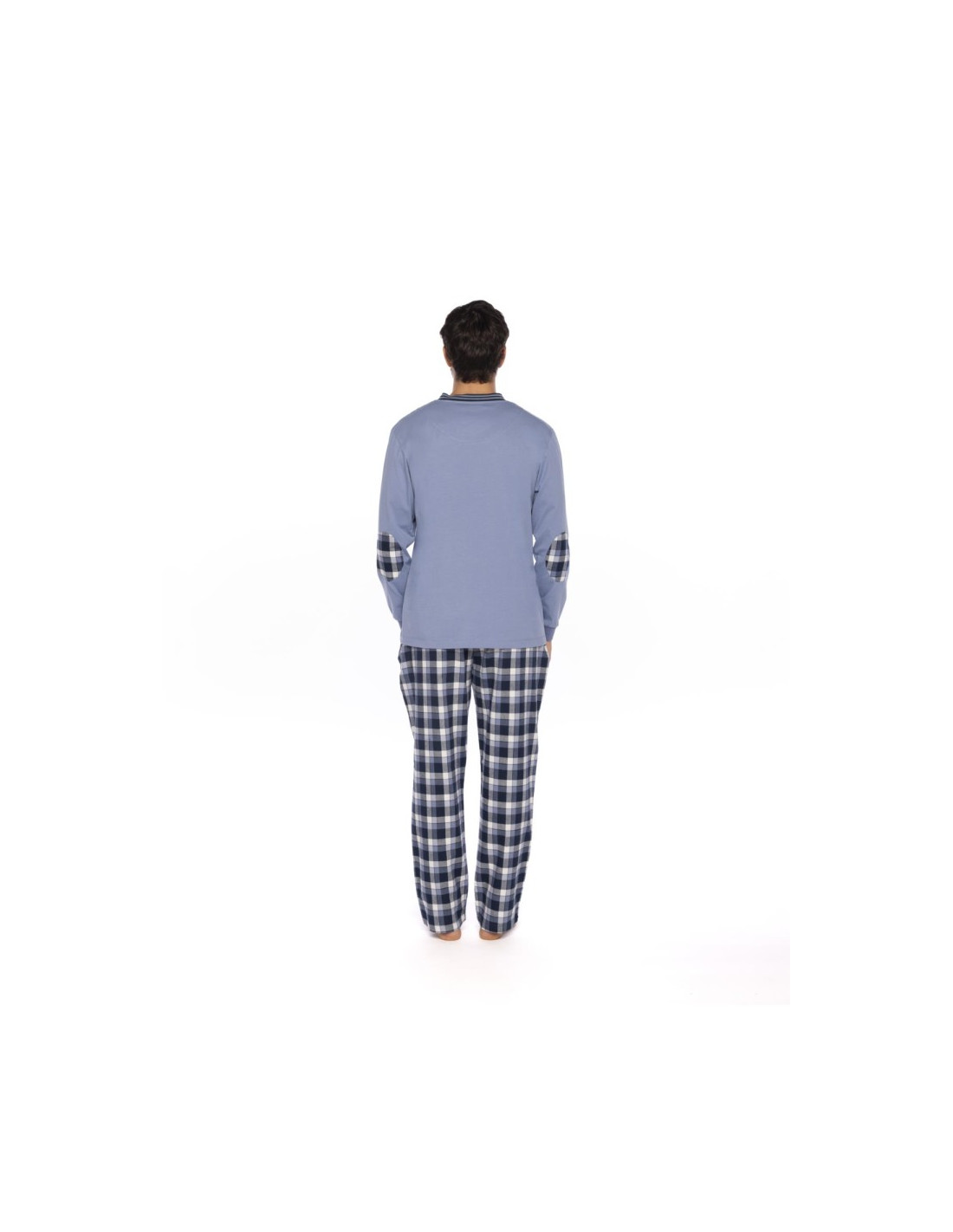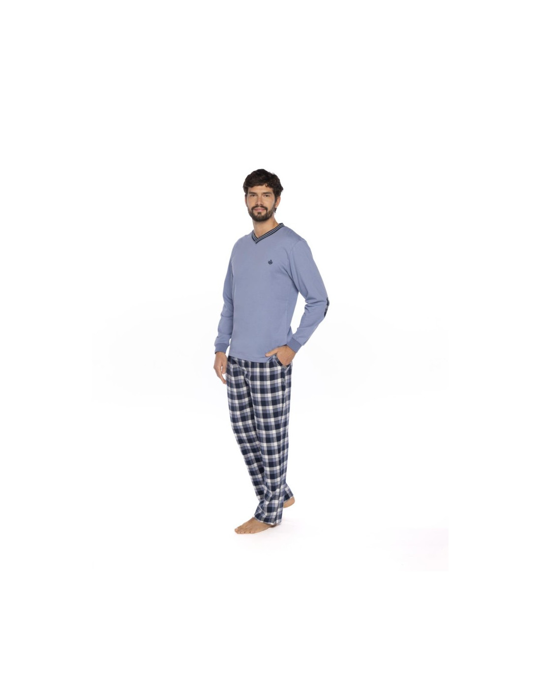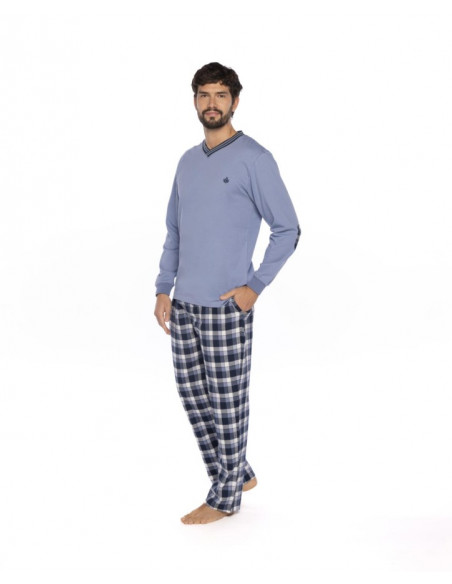 La camiseta de manga larga y cuello pico, está hecha en suave punto de algodón y se presenta en un sobrio tono azul claro. El pantalón largo, en contraste, está confeccionado en viella, un tejido ligero pero cálido, con un atractivo estampado de cuadros en tonos azules.